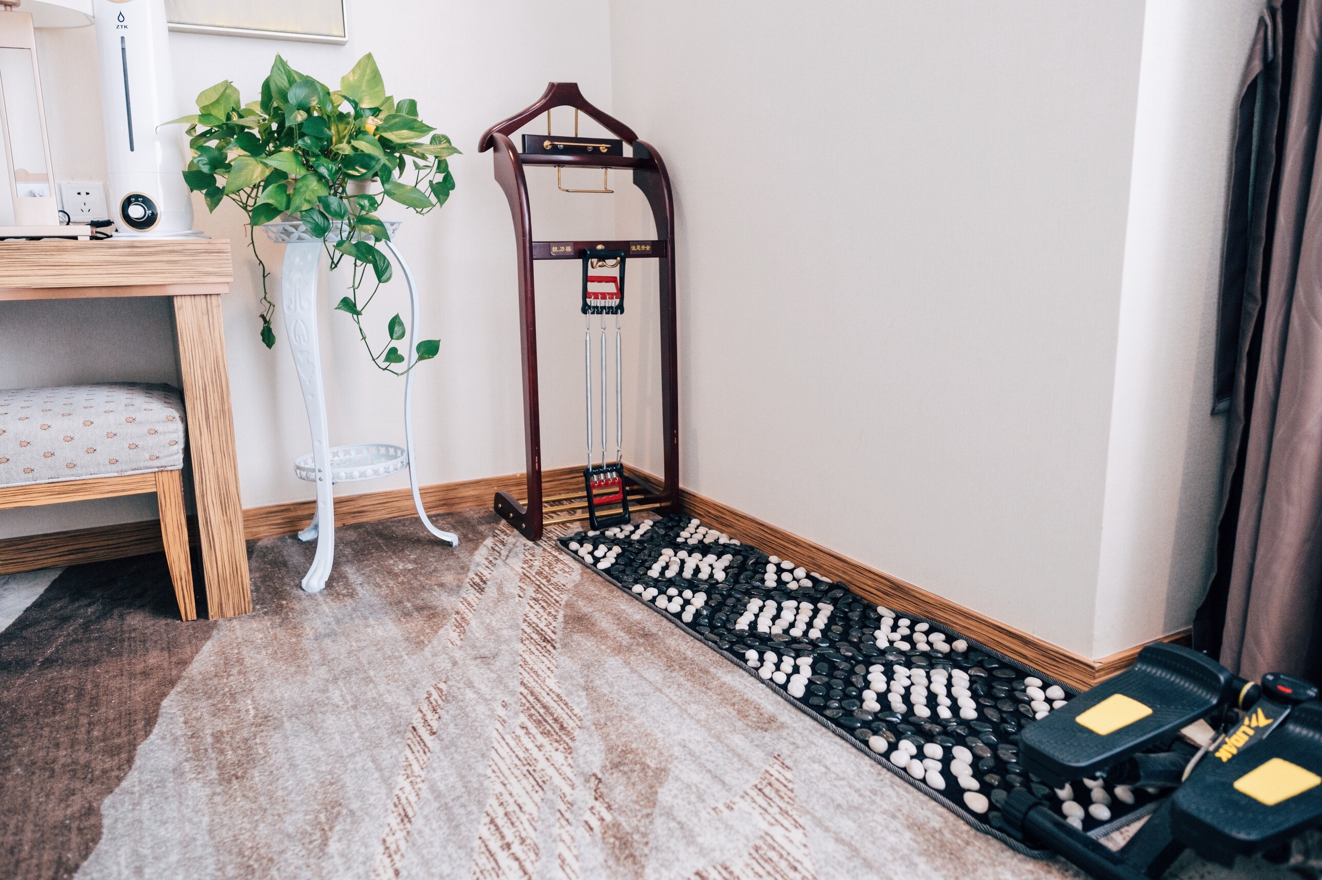 房间的设置相当齐全,星级的标准,除了常规酒店那样的设施之外,还贴心的准备了加湿器,还有健身器材,这样也正好解决了很多人没有太多时间去健身房的问题。