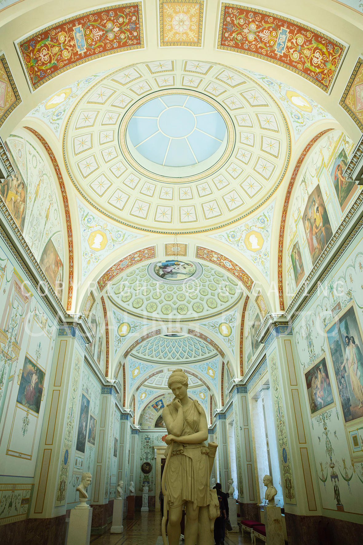 凯瑟琳大帝在1775年参观过梵蒂冈的拉菲尔壁画之后,非常喜欢。下令将整座走廊都复制重现。长廊的两端、柱子、顶、圆拱和墙上,共复制了52幅圣经题材的绘画作品。描绘了从上帝造人、造万物以及创世纪等场景。该绘画系列被后人称为《拉斐尔的圣经》,尽头一幅是《最后的晚餐》。
