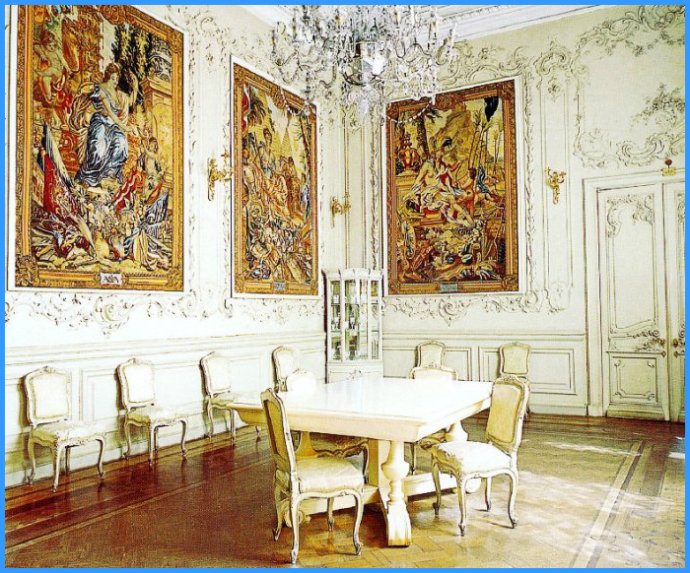 这里曾是于礼仪接待和沙皇宴请官员的地方。二战期间,炸弹直接落到大厅严重损坏了这里,一直到1946年大厅才全部修复完毕。