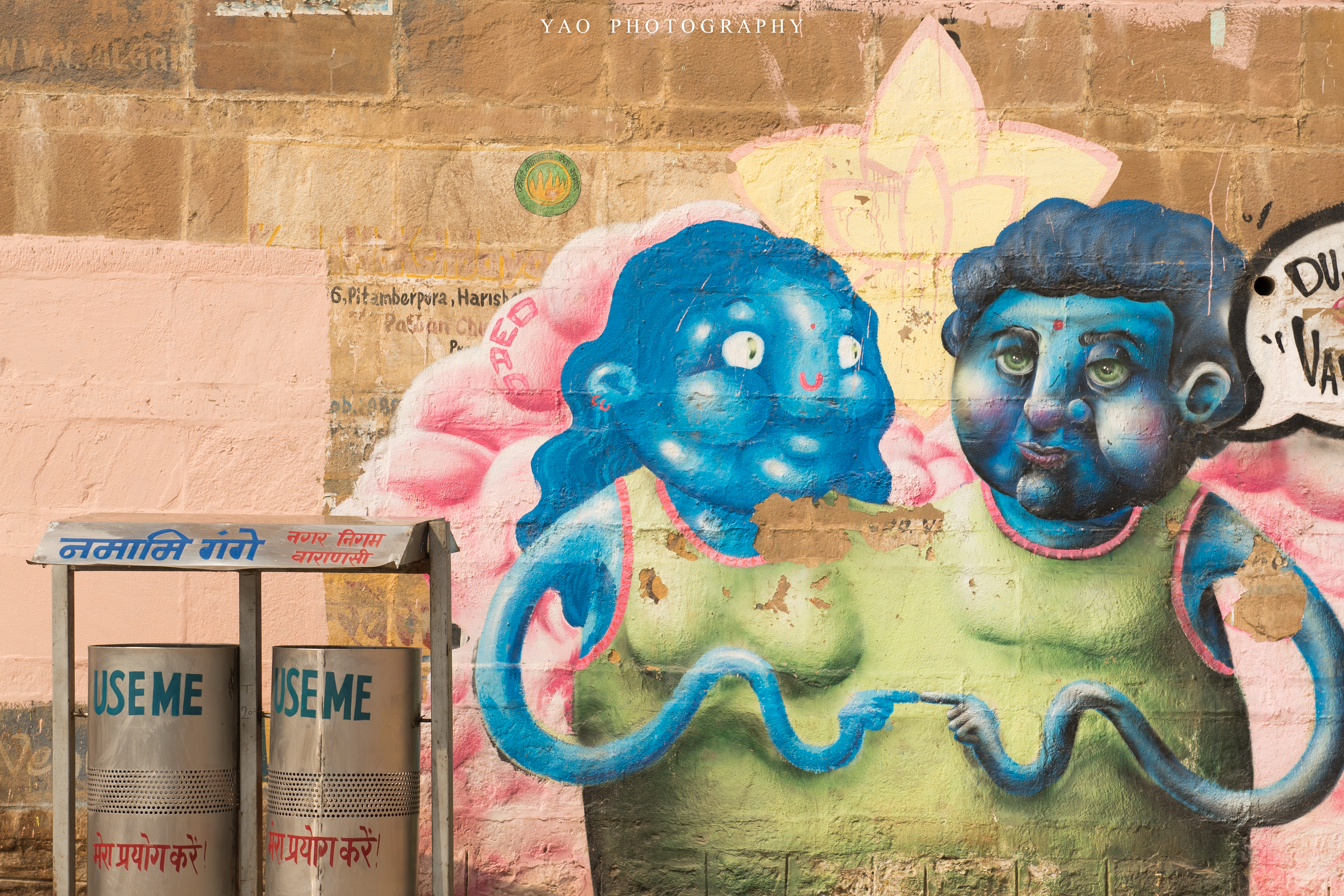 恒河 边的柱子和墙上随处可见湿婆的图像,还有Q版的 ,又一次体现了 印度 人的幽默!