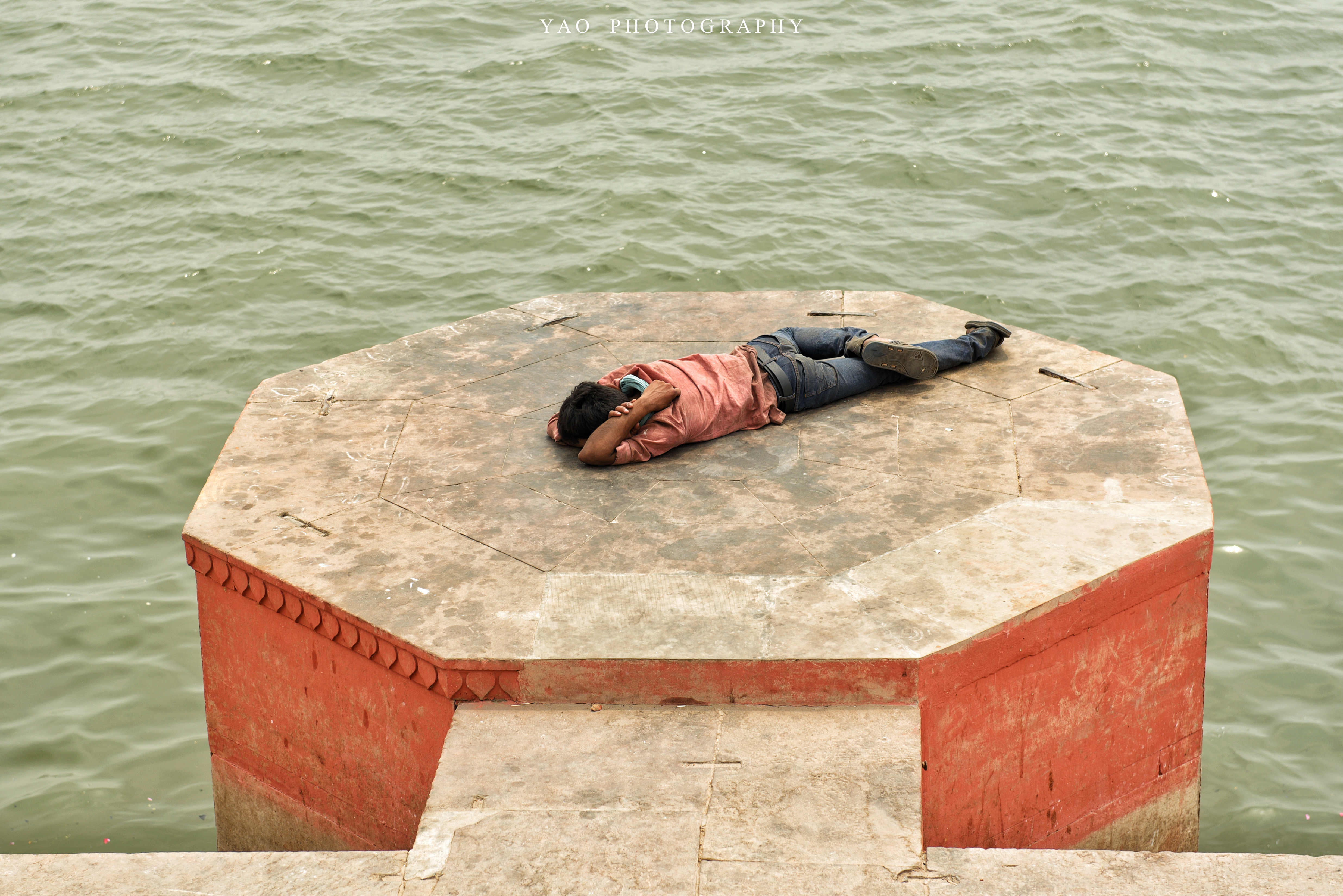 河岸的台阶上一副和谐的生活场景,久居在伞下的人们、刮胡子的大叔、台阶码头上睡觉的少年......虽然物质生活条件相对较差,但是在他们脸上,更多地是满足和怡然自得,再一次感叹宗教的力量
