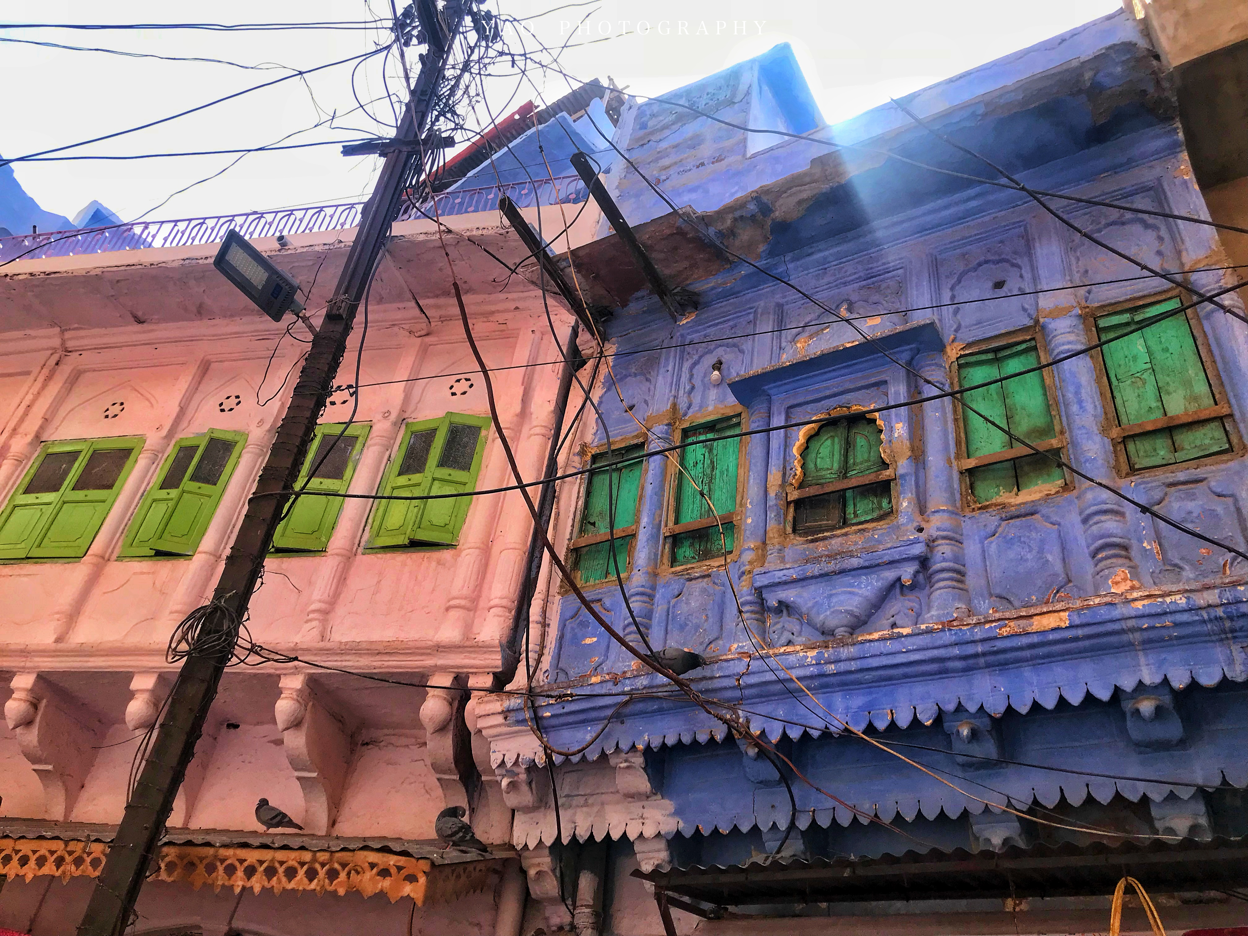 瓦拉纳西 的街巷曲折狭窄,穿梭其中的人们大都表情冷漠;巷道的平台上隔几步就坐着一位冥想的苦行僧;拐个弯就能看到持枪的武装警察(这种情况在别的城市从未见过);电线、店牌杂乱的绕在并不高的头顶上方,给人一种幽闭的压迫感;地上牛粪、各种垃圾、臭水洼琳琅满目,排水系统看上去也不是很好,不敢想象雨天巷子会是怎样一幅场景,我不得不提着裙子走路,让我们瞠目结舌的是,很多当地人都在赤脚行走,如此脏的地面他们就这么若无其事的踩下去,也许这就是宗教的力量吧,洁净的内心包容了具象化的脏乱