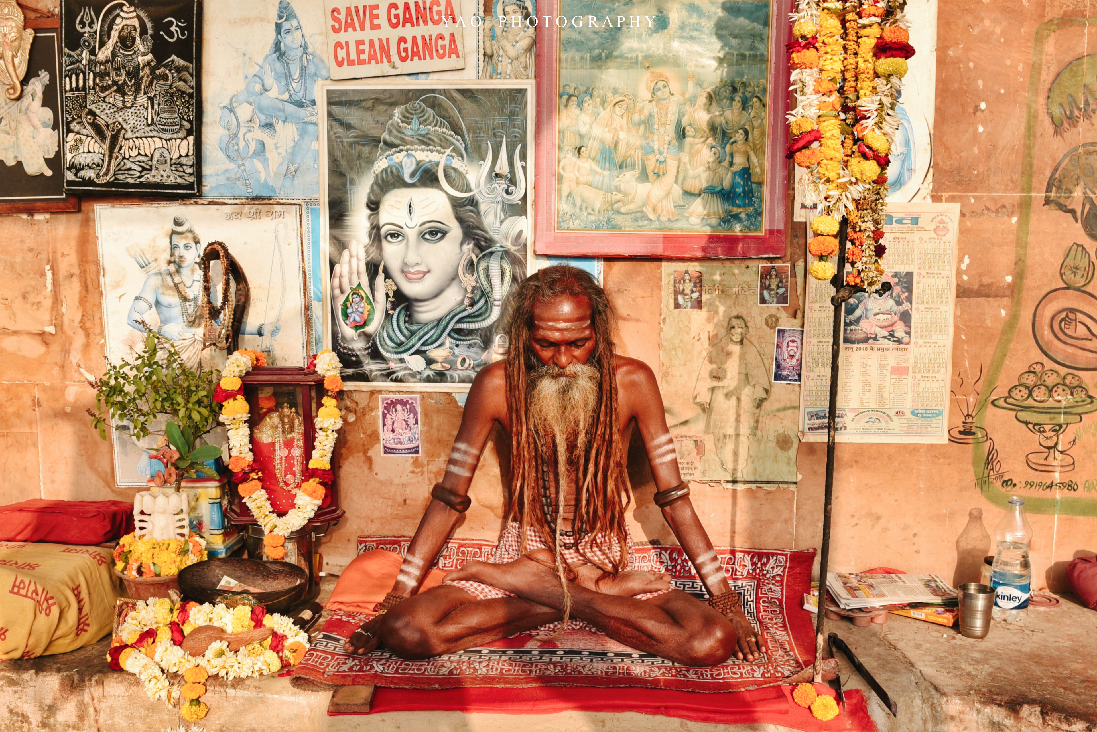 蓬头垢面的苦行僧在虔诚的冥想,身后的墙上贴满了湿婆的画像,旁边立着象征湿婆神的三叉杖。这些苦行僧食、住、行都在 恒河 岸边,长期断食甚至断水、忍受着 印度 的酷热、严寒等事情,来锻炼忍耐力和离欲。
