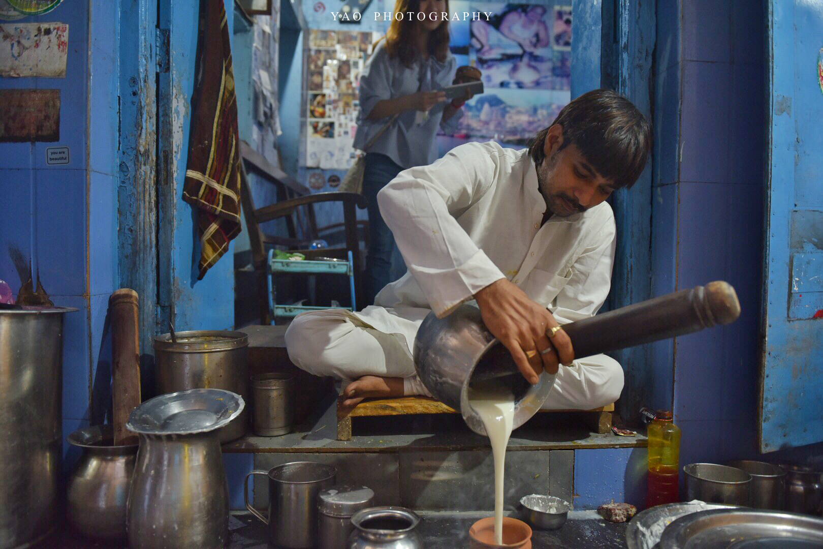 Google地图在繁杂的小巷里作用微乎其微, 我们在迷宫般的巷子里绕了大概十几分钟,终于找到了网红lassi店,蓝色的门头和墙壁使这家店在阴沉色调的巷子里异常醒目、独树一帜。店对面有一只神牛在漫步,地面、墙壁依然是脏兮兮,厨师的手黑乎乎的、指甲里满是污垢,店里的几个白人吃的很high,有时候真的很佩服白人这种随性的状态。我们仨进店里等待,可是我的嗓子突然咳嗽的更厉害了,(因为早上一来对空气很不适应,我们仨下午出门还特地带了口罩),可见这个巷子的空气比踏足 瓦拉纳西 的那一刻更污浊。