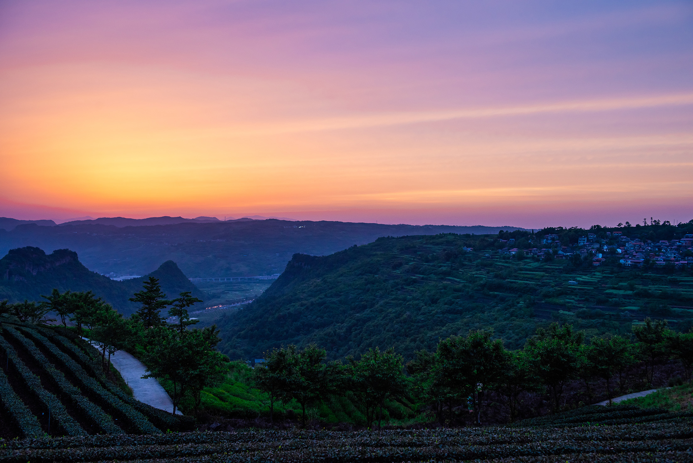 提前查好日落时间,适时前往拍摄日落的地方——穿岩十九峰,这个穿岩十九峰并不是指穿岩十九峰景区,而是位于新昌县的下岩贝村,一路攀沿弯曲的山路,到达一个宁静而优雅的山村,漫步在乡间翠绿的茶园,从这里远眺穿岩十九峰,这里有大片的丹霞地貌,十九峰连绵起伏从南到北,形态各异,这里常年笼罩在轻烟浓雾之中,仿若仙境。