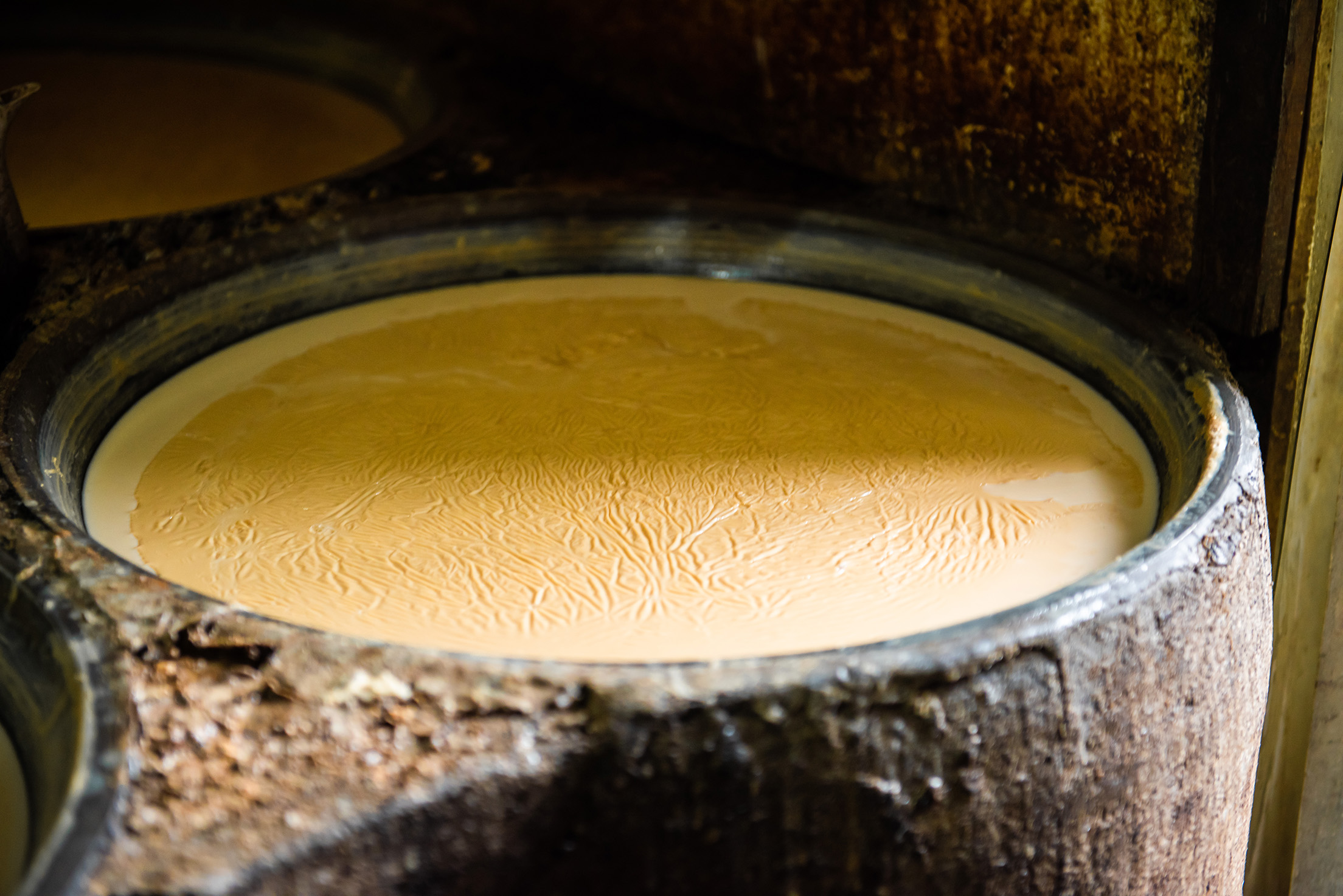 把泡好的黄豆磨成浆,用滤布将豆渣和浆分开,小火慢慢烘着一口口铁锅。