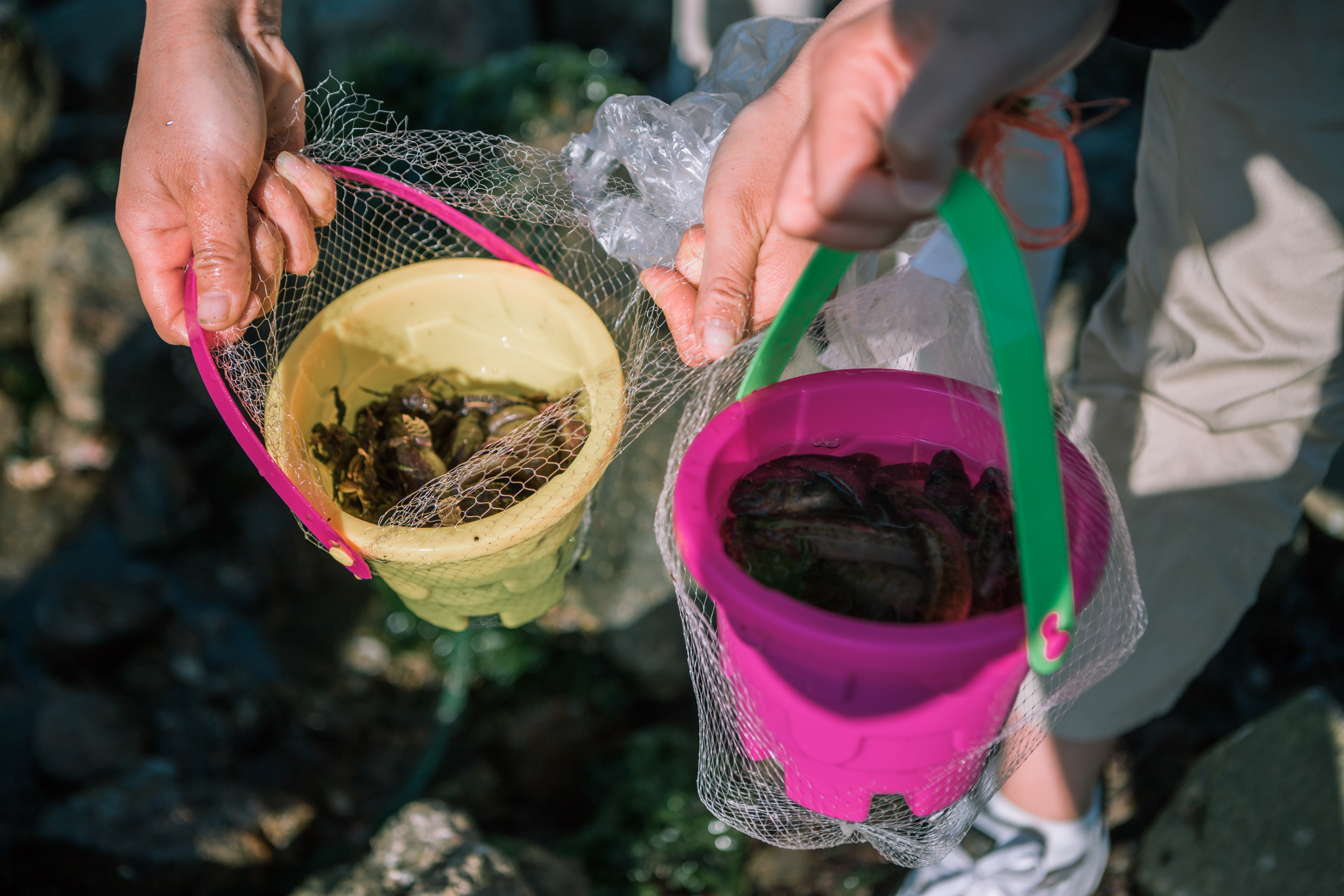 这里临近海参的养殖区,所以很多游人和当地人在这赶海,搬开海滩上的石头就能发现躲藏在下面的”丰富“海产。从小鱼小虾到海参鱿鱼,运气好,一个下午就可以安排一顿丰盛的海鲜大咖晚餐。
