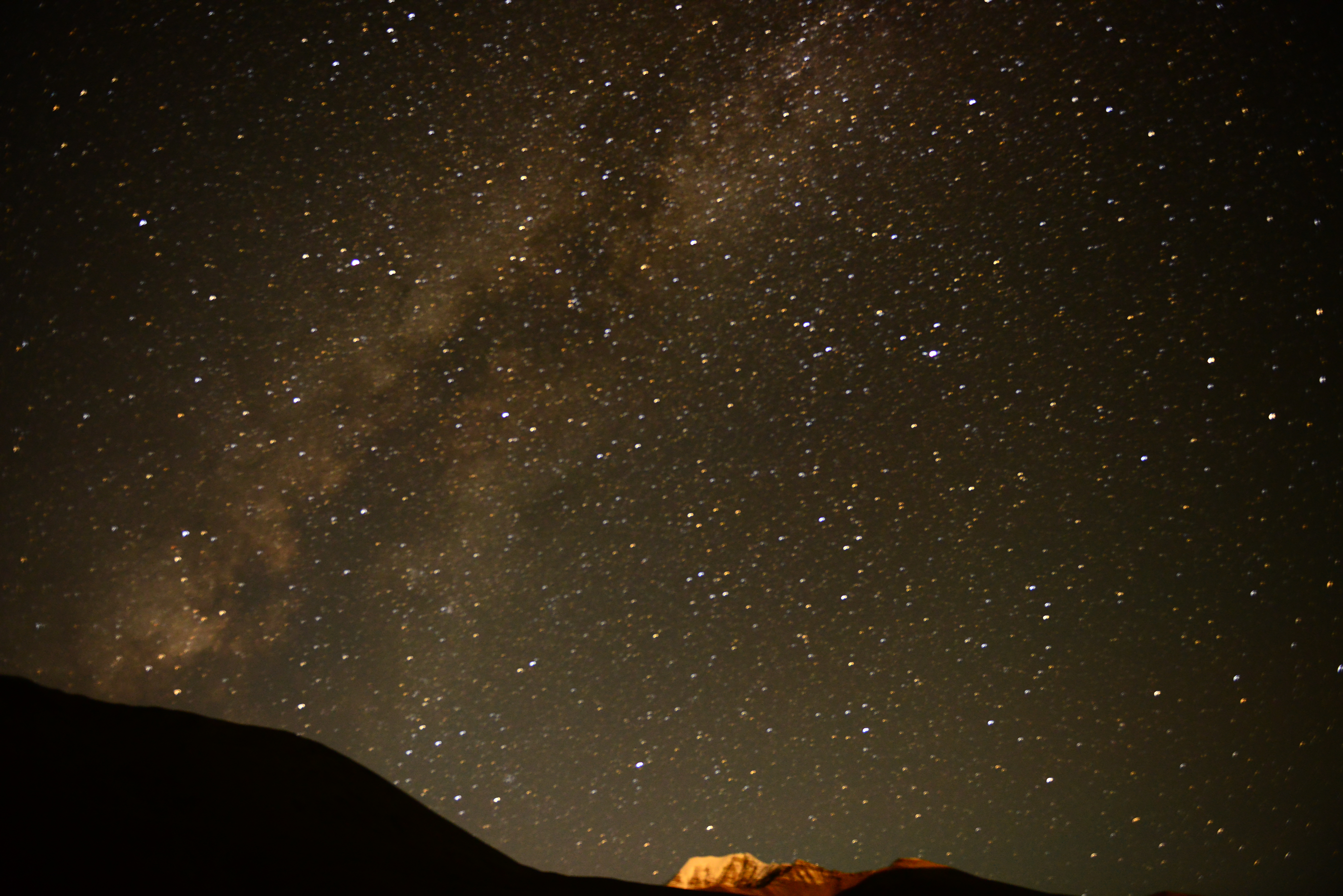因为考虑高原气候体力情况,我没有带三脚架,住宿珠峰大本营帐篷里,一个北京来的哥们,愿意和我一起共用三脚架,于是两人结伴,在珠峰大本营景区的山谷里寻找没有灯光打扰的地方,架起三角架,轮流用自己的相机,不管对准对不准星空,努力拍摄起珠峰的星空夜,这一张比较清晰,星空下的珠峰,是在景区管理员催促回帐篷之前运气爆棚,让只有蹩脚的星空拍摄水平的我觉得,对焦构图还算满意,可以说2人都比较惊喜。在景区管理再三催促押送下,意犹未尽的回到帐篷,然后在黑漆漆的帐篷里,呼声阵阵下,倒腾那几张满意惊喜的珠峰星空照片。还是要再次感谢这位北京的微信号adamkau的哥们,没有你大方的借我三脚架,在海拔5200米的珠峰大本营,星空夜不会这么难忘和完美。