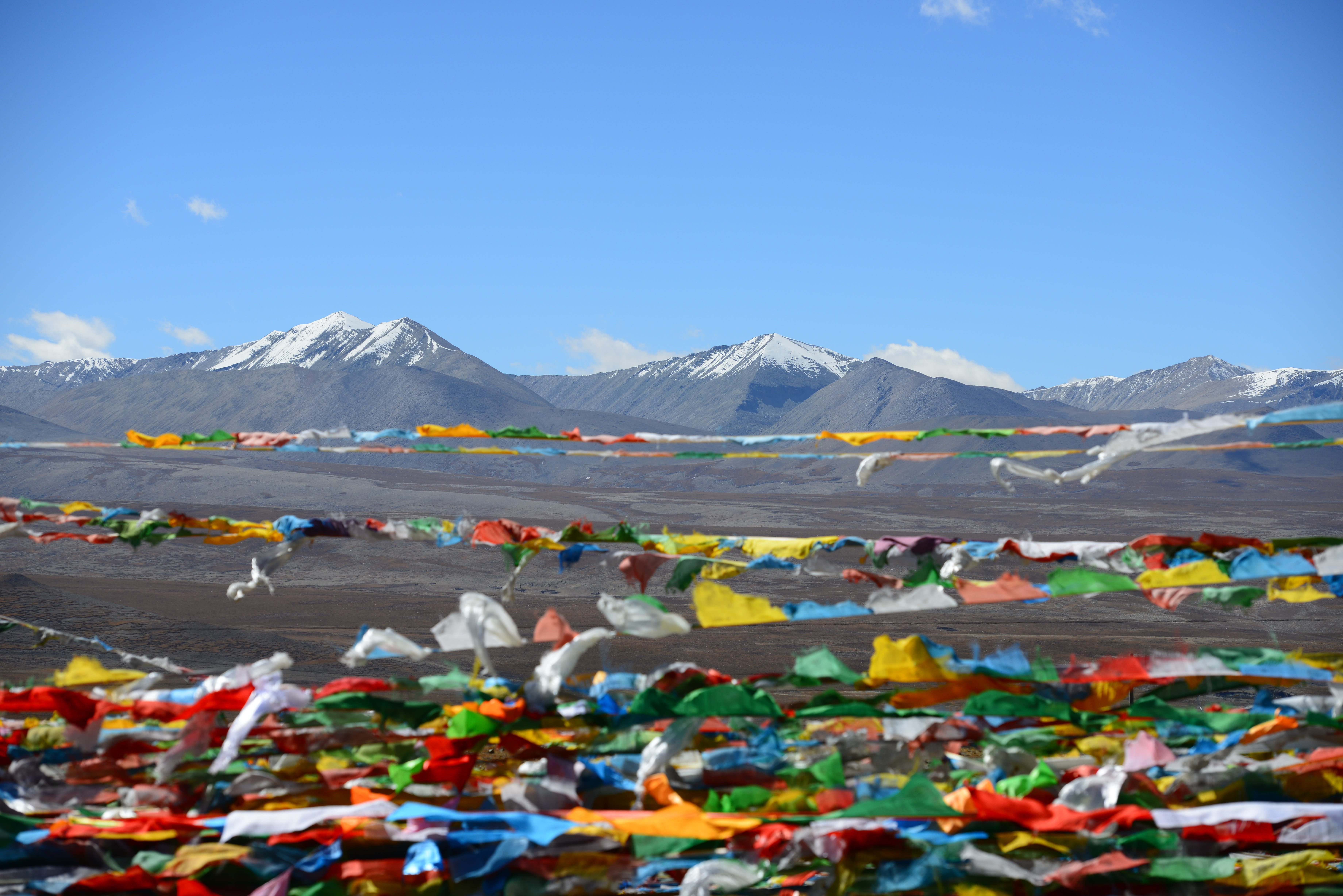 路途的游客中心,海拔4353.8米的斯米拉神山,五彩经幡铺满蓝天下的山坡。