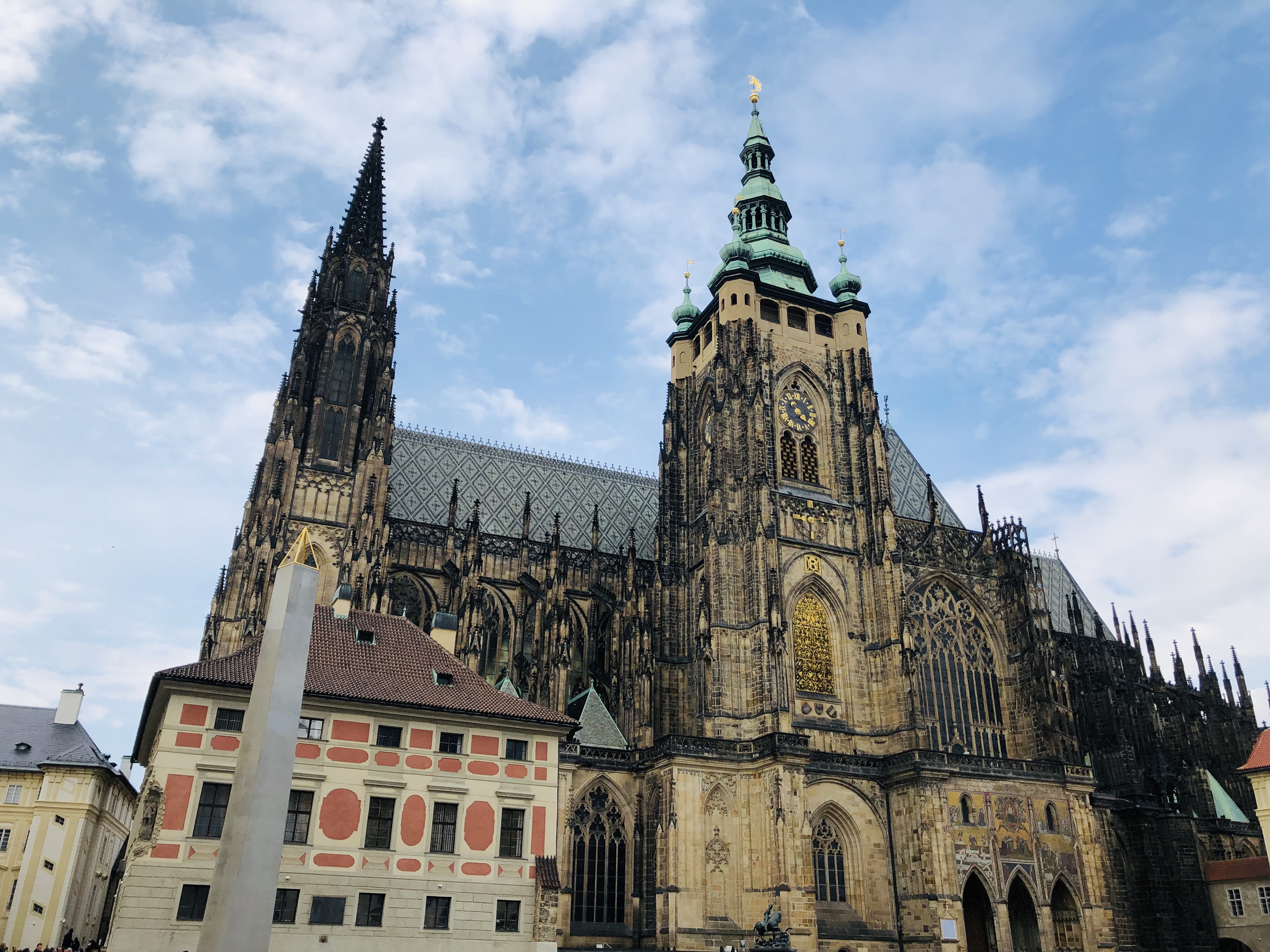 圣维特大教堂(St. Vitus Cathedral)位于布拉格城堡内,是哥特式建筑的精彩范例,其中有许多波希米亚国王的坟墓,是捷克最大、最重要的一座教堂。大教堂是历代皇帝举行加冕典礼的场所,有"建筑之宝"的美誉,如今这里收藏有十四世纪神圣罗马帝国间波希米亚国王查理四世的纯金皇冠、金球及令牌,塔顶有文艺复兴式样的大钟,钟楼是俯瞰布拉格市景最美的地方,如果脚力还行,不妨尝试一项健步运动,攀爬教堂高塔里287级楼梯,登高嘹望整个布拉格城,当你.上气不接下气地终于到达塔顶时,令人屏息的百塔美景,将令你感到真正值回票价。