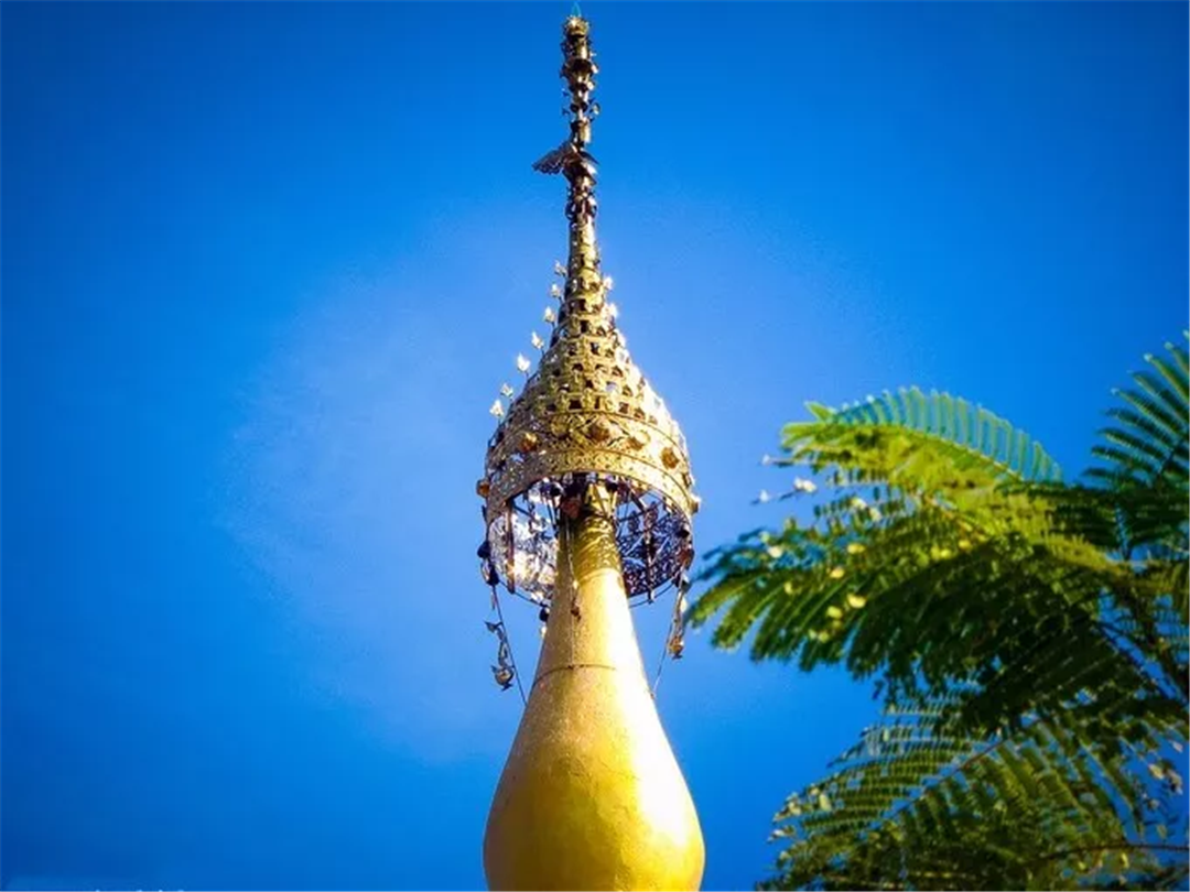 一塔佑两国——芒秀佛塔金碧辉煌,在湛蓝天空下熠熠生辉,在凤凰树环绕中光彩照人。
