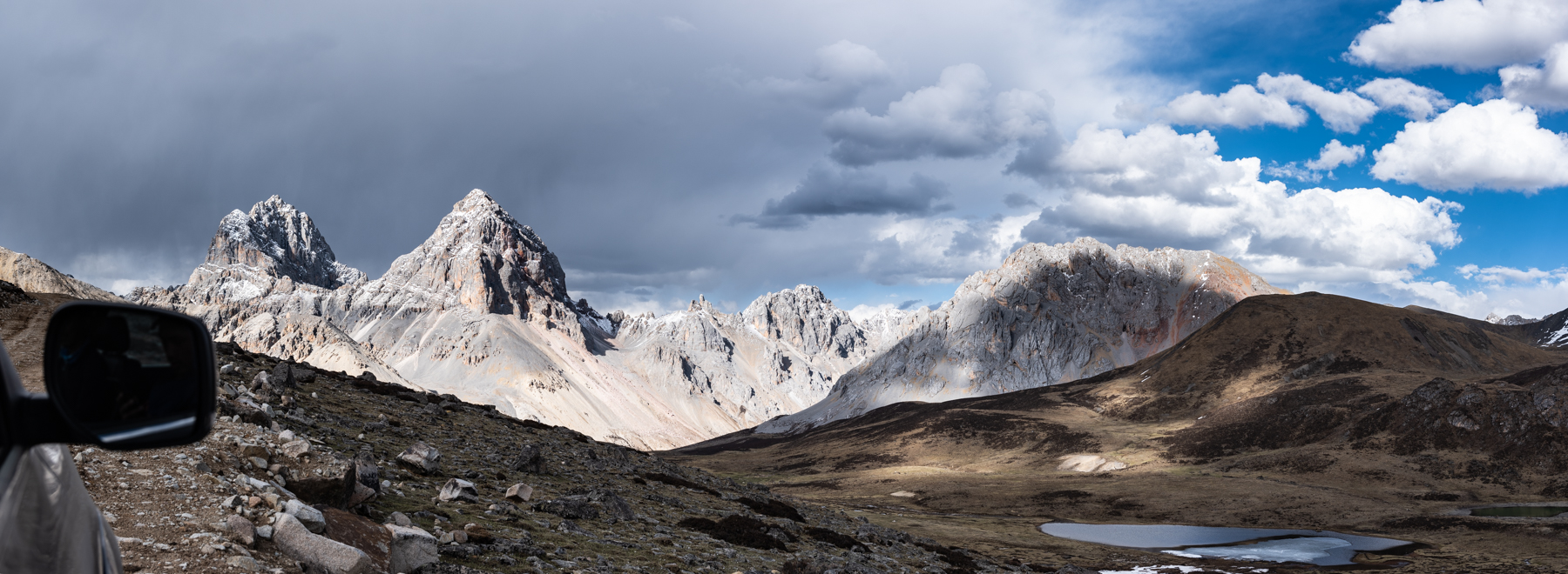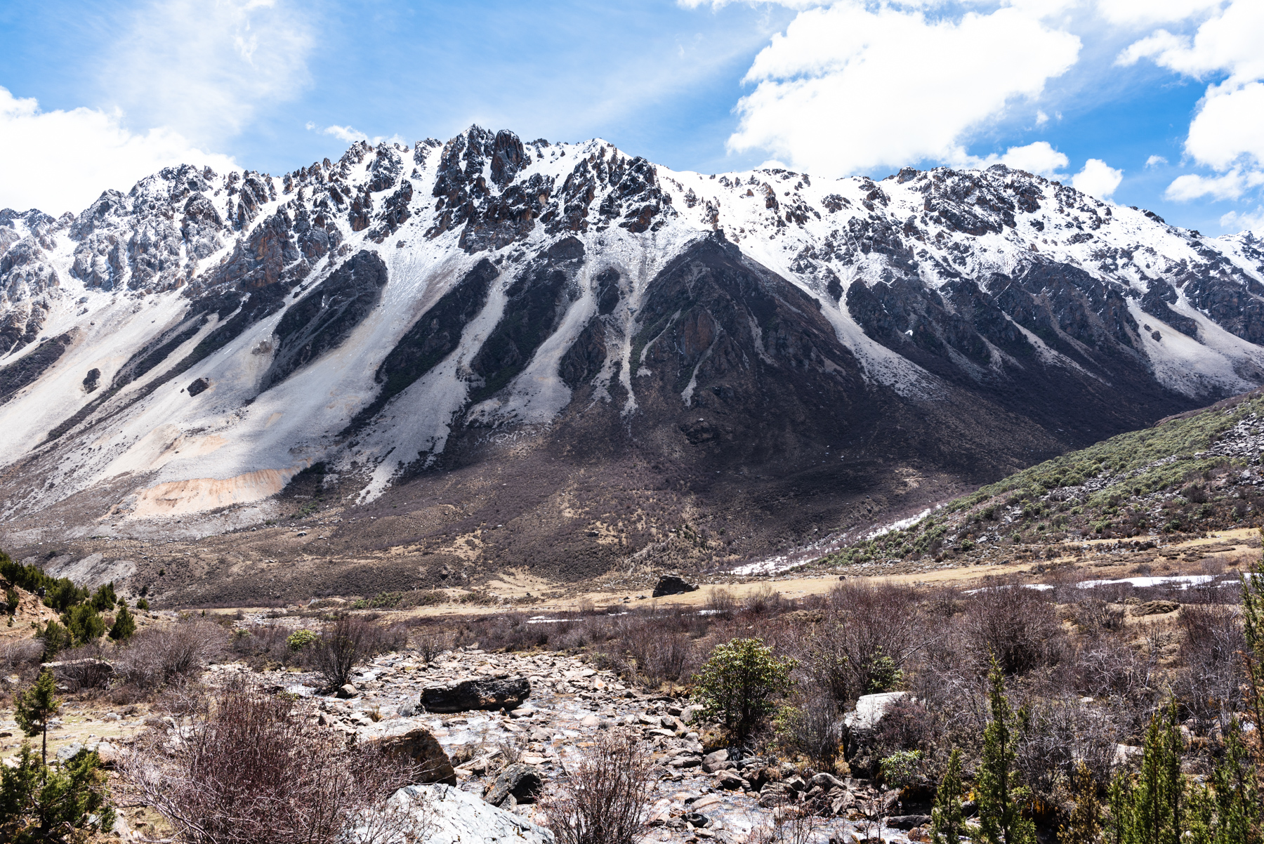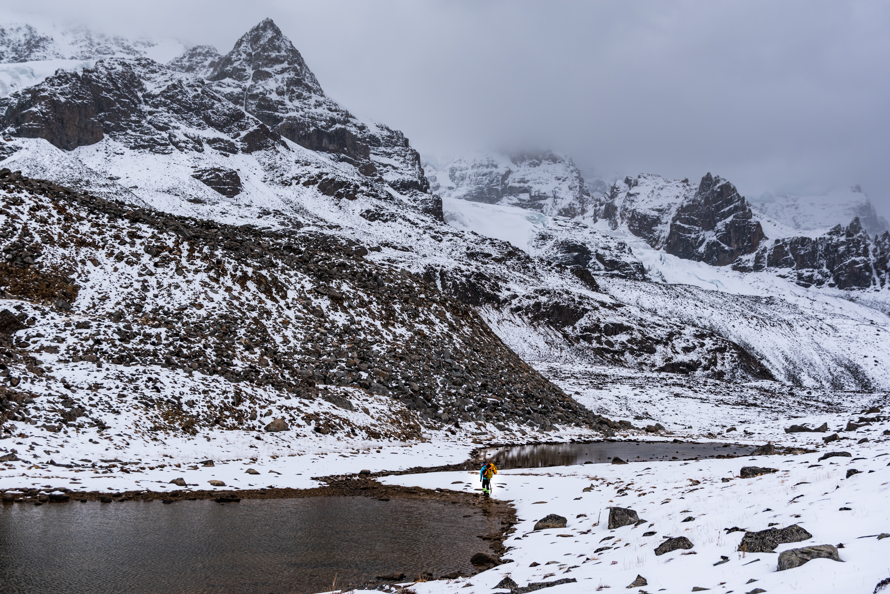 先是各种灌木丛阻碍我们前进,随着海拔的升高,灌木已经慢慢的被我们甩在了身后,4700米左右植被就很少了,眼看垭口就在前方我们卯足了劲的往上爬,此时阻碍我们前进的变成了大石头和20多公分的雪,深一脚浅一脚的,折磨人啊。我们几近奔溃后相继翻上了垭口,在垭口前可以清晰的看到党结真拉峰顶的悬冰川。