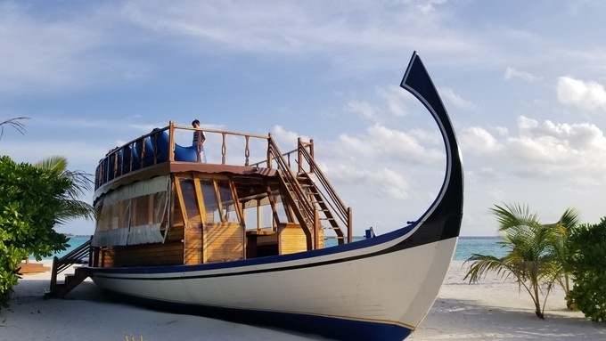 第四天第二次来小岛是为了赏日落,可以先在酒吧点些酒水,仍然是房间冰箱里有的种类都可以免费,其余的需付费。我们点了两杯酒,酒吧的服务员告诉我们不能点太复杂的鸡尾酒,因为酒水都是通过船运过去对面小岛,如果太复杂的鸡尾酒就需要带很多材料。然后就坐船过去了,点的酒水什么的,会有服务生拿过去找到我们,送到我们面前,除了酒还会送一小碟小食。我们就在小岛上面的一艘酒吧一样的船上,面朝大海,喝着小酒,赏着日落 ,好不惬意。