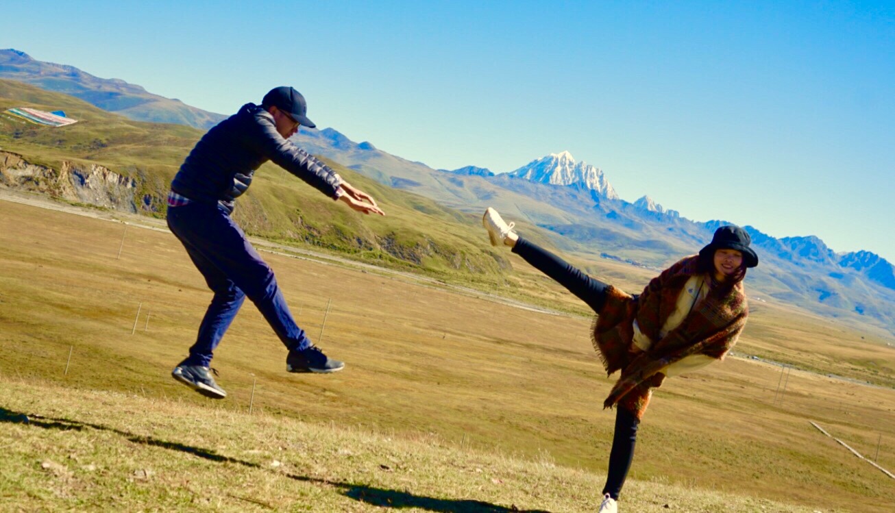 成都还在绵绵细雨,进入川西地区,天气晴空万里,蓝天白云,处处拍大片,先来一波我们的合照。