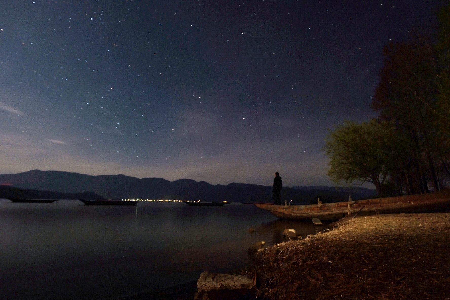 我想伸手去触碰这璀璨星空,美的让人舍不得闭眼,微风吹来,隐约听见湖水拍打船的声音,如梦如幻。