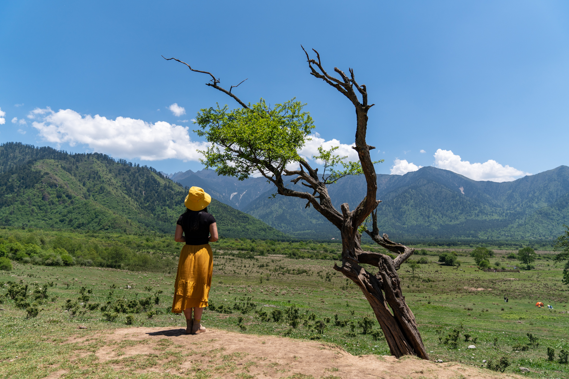 于是我直奔高山草甸处停留,这里有一颗歪脖子网红树,传说是帮助孟获的那颗神树,五月来已经长出了绿叶。这趟旅程,一个人出行,带上三脚架,除了往返占据比较多的行车时间,其余的都是自己的时间了,还是有空可以给自己留影几张的。