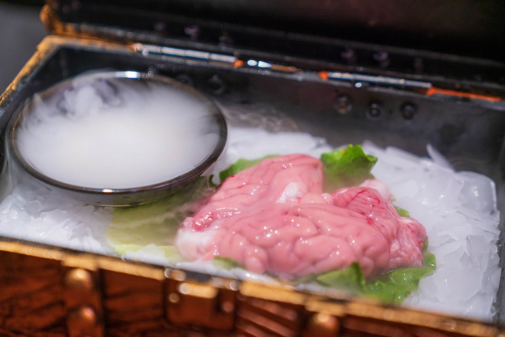 这月光宝盒鲜脑花是最让人难忘的招牌菜,上菜时用的干冰营造出腾云驾雾般的仙气,他们家主打脑花“无血水,无异味,更入味”,脑花煮了吃起来很嫩,蘸点辣子,香辣有味。
