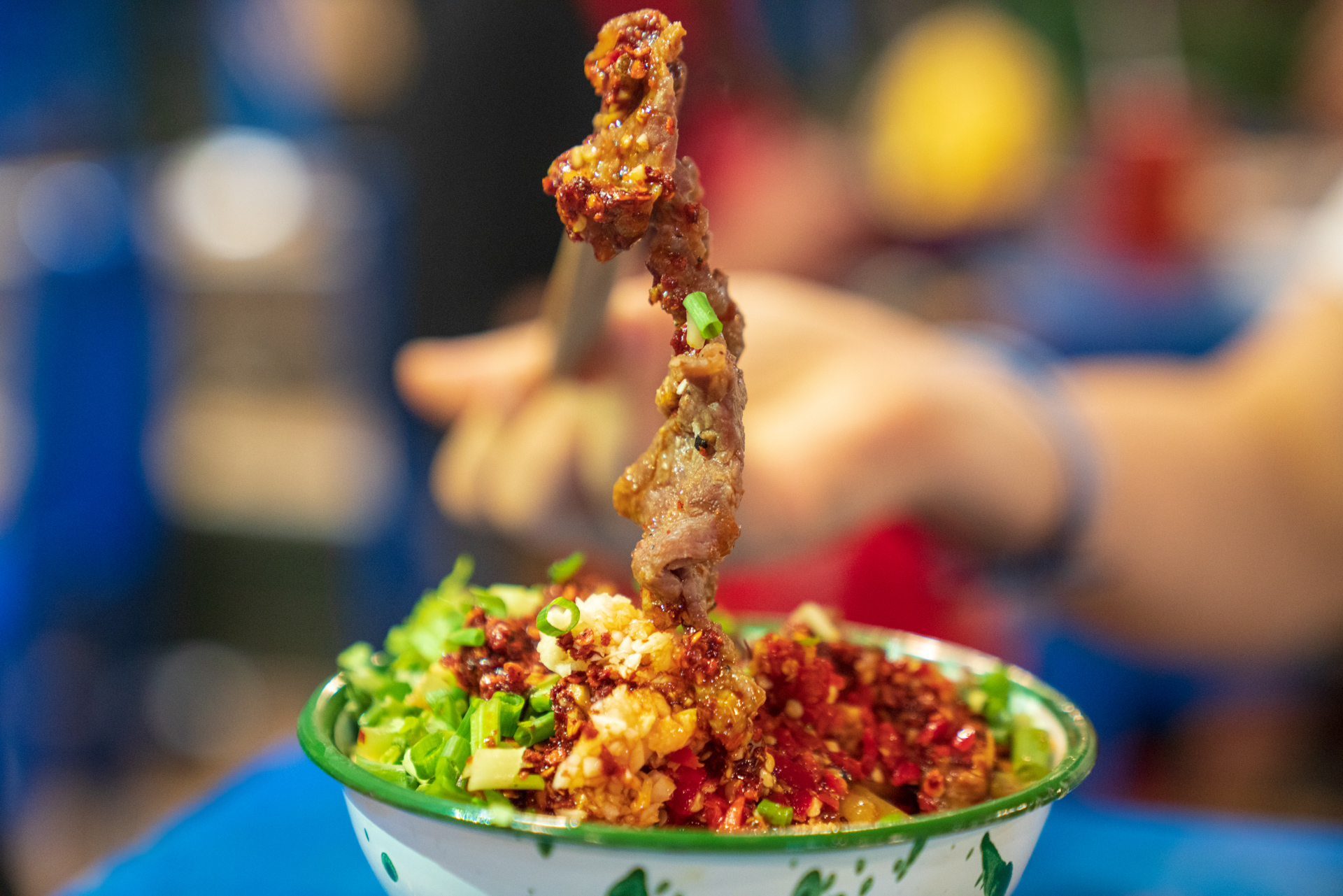 我最喜欢跟樊凯凯一起出门了,上回新疆一个夜夜笙歌,大乌苏在旅途中从未缺席,这次也是一样,该吃吃,该喝喝。深夜饮酒快乐无极,更何况还有这么好的下酒菜,得劲儿焖烤肉串配有好几种蘸料,让你的完全可以根据自己的喜好搭配更美味的肉串。