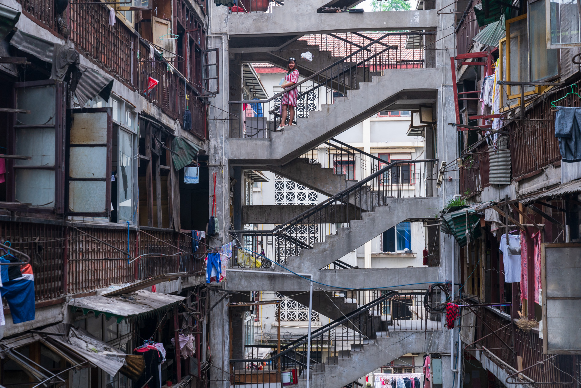 这栋居民楼是由两栋住宅构成,两栋楼之间设有两个交叉的“之”字楼梯,特别有意思,很有老香港的感觉。