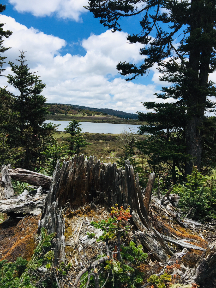 接近山顶的森林大多只剩下光秃秃的枝干,呈现出一派火炙后的焦黑。向导说这片林毁于虫灾和山火,但当地人一般把它也“顺便”归咎到陈凯歌和他的《无极》剧组,看来说碧沽天池因陈凯歌和《无极》而出名并不为过。