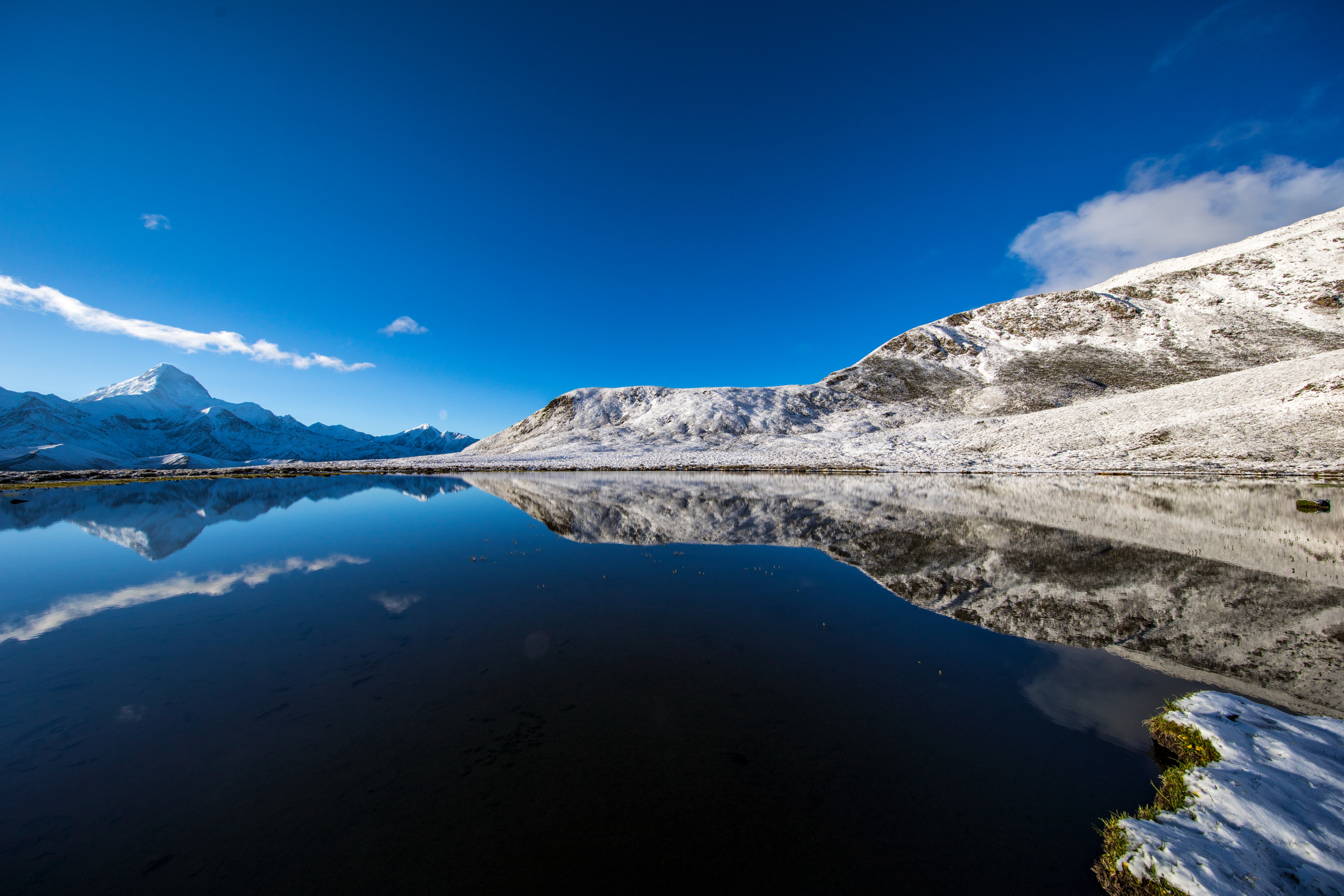 雪后的世界如此静谧,白雪皑皑的大地如此的宁静祥和~三嗯措的水面如同镜子般映衬着贡嘎的身影。