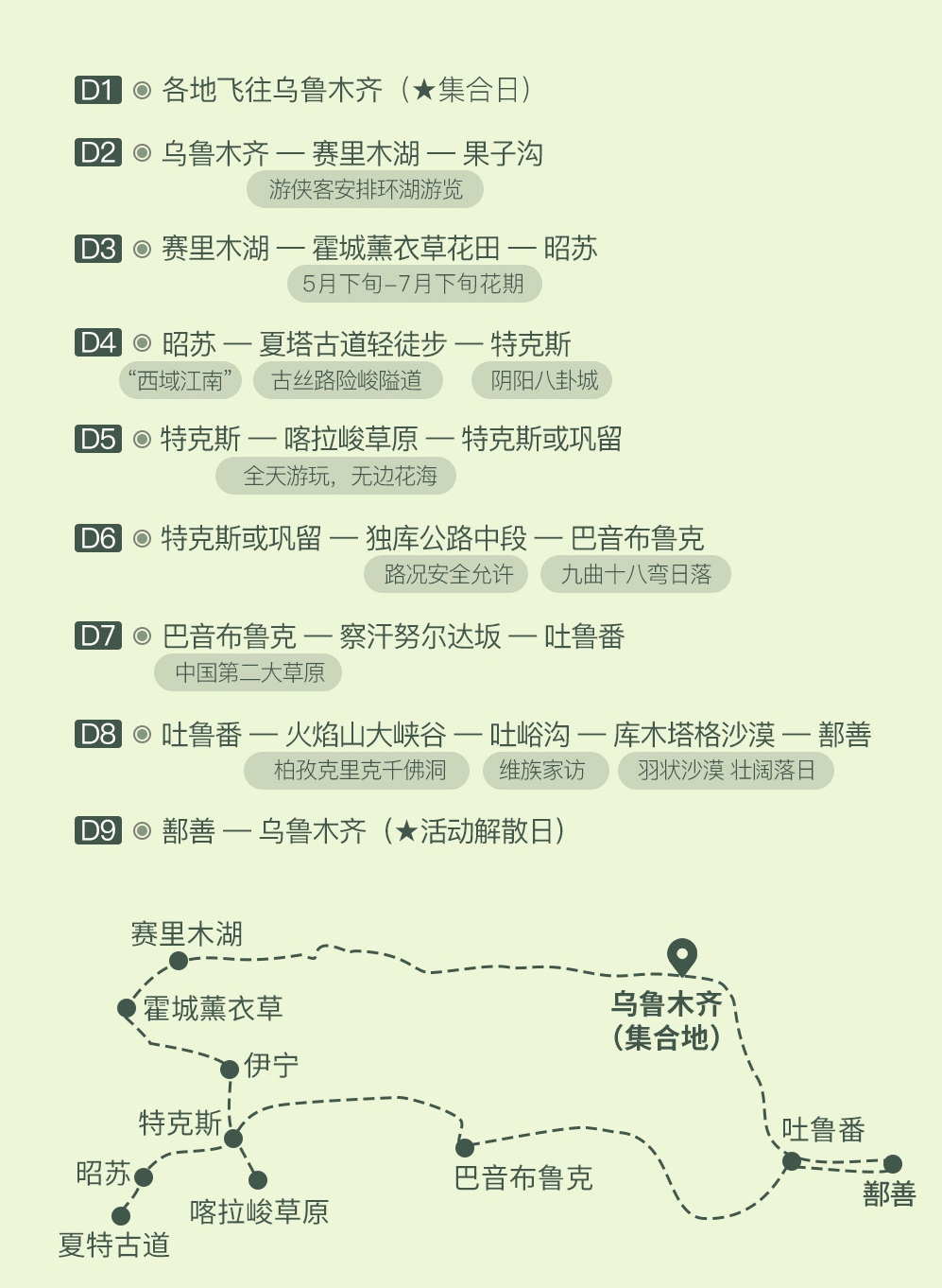 新疆位于我国西北边陲,占全国陆地面积的六分之一,是我国最大的省份。可以分为南北疆,以天山为界,南北疆差异明显。此次行程主要偏向于北疆地区,每天都有着不一样的景观体验:森林、草原、雪山、湖泊、花海、湿地、沙漠、戈壁、古道、人文、遗址、宗教,每一处风景都像自己处于电影中的情景,让人回味无穷,所以总是有人说新疆是一种瘾,去过一次后你会再去第二次第三次第四次。。每次去都会有不同的惊喜!总之,来新疆绝对可以欣赏到不一样的两国风情,足不出国就能感受他国的韵味。