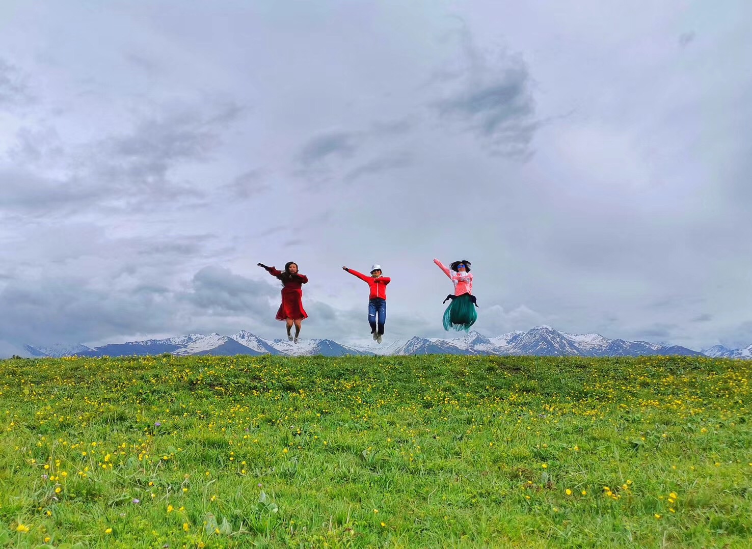 骑马啦,脚下是野花,身后是乌云,耳边只有风声,向着雪山奔跑。一个字,爽。骑马溜达时,哈萨克人一起唱歌,我们当然是还珠格格啦。