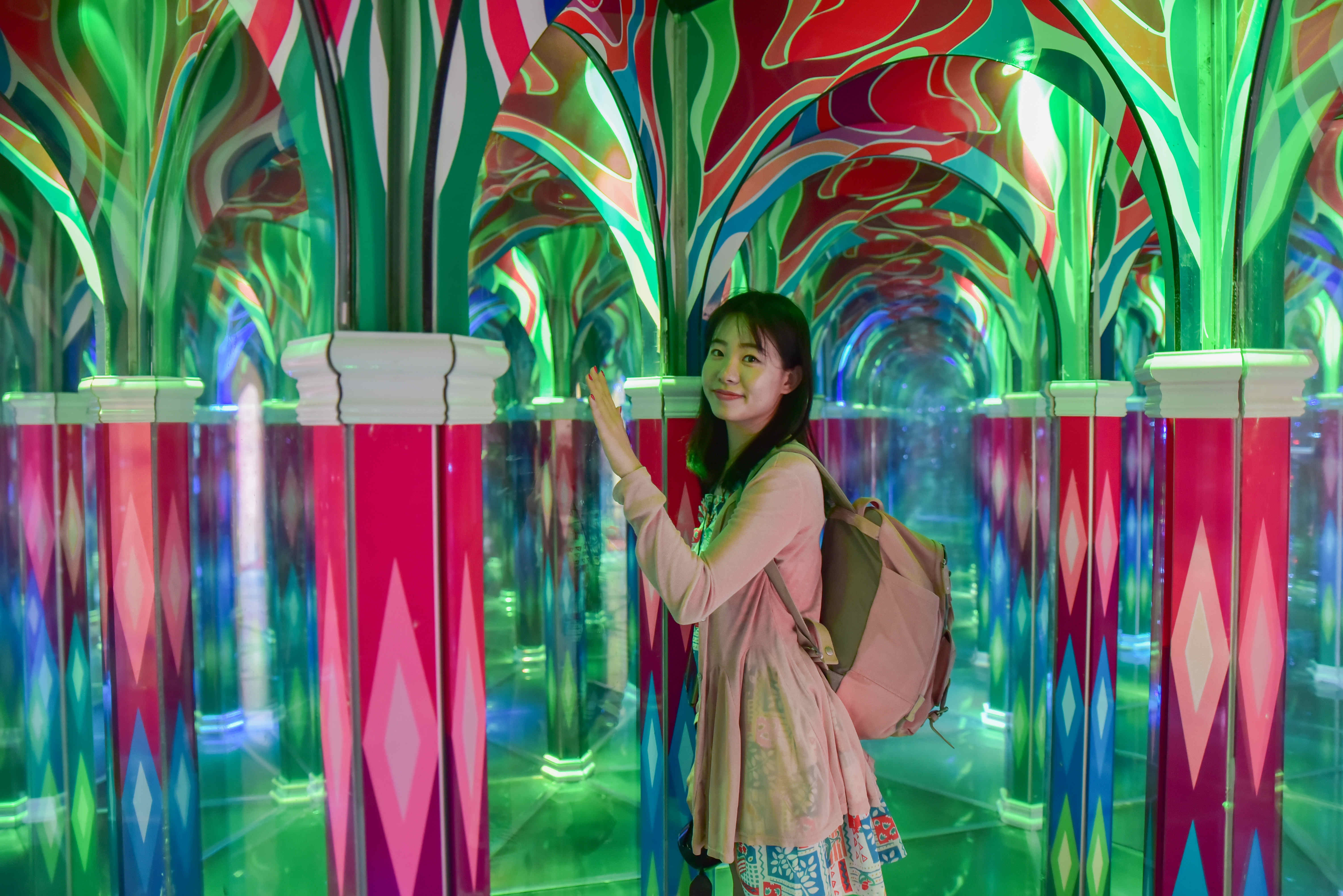 在入园处不远,我们来到第一个体验项目——梦幻时空,梦幻时空是运用科技打造出来美轮美奂的灯光秀表演,带来超感官的视觉体验,几秒钟的时间整个空间变幻出不同色色彩,变幻无穷又不会让人头目眩晕,让人恍若流连在一片迷幻的梦境当中。