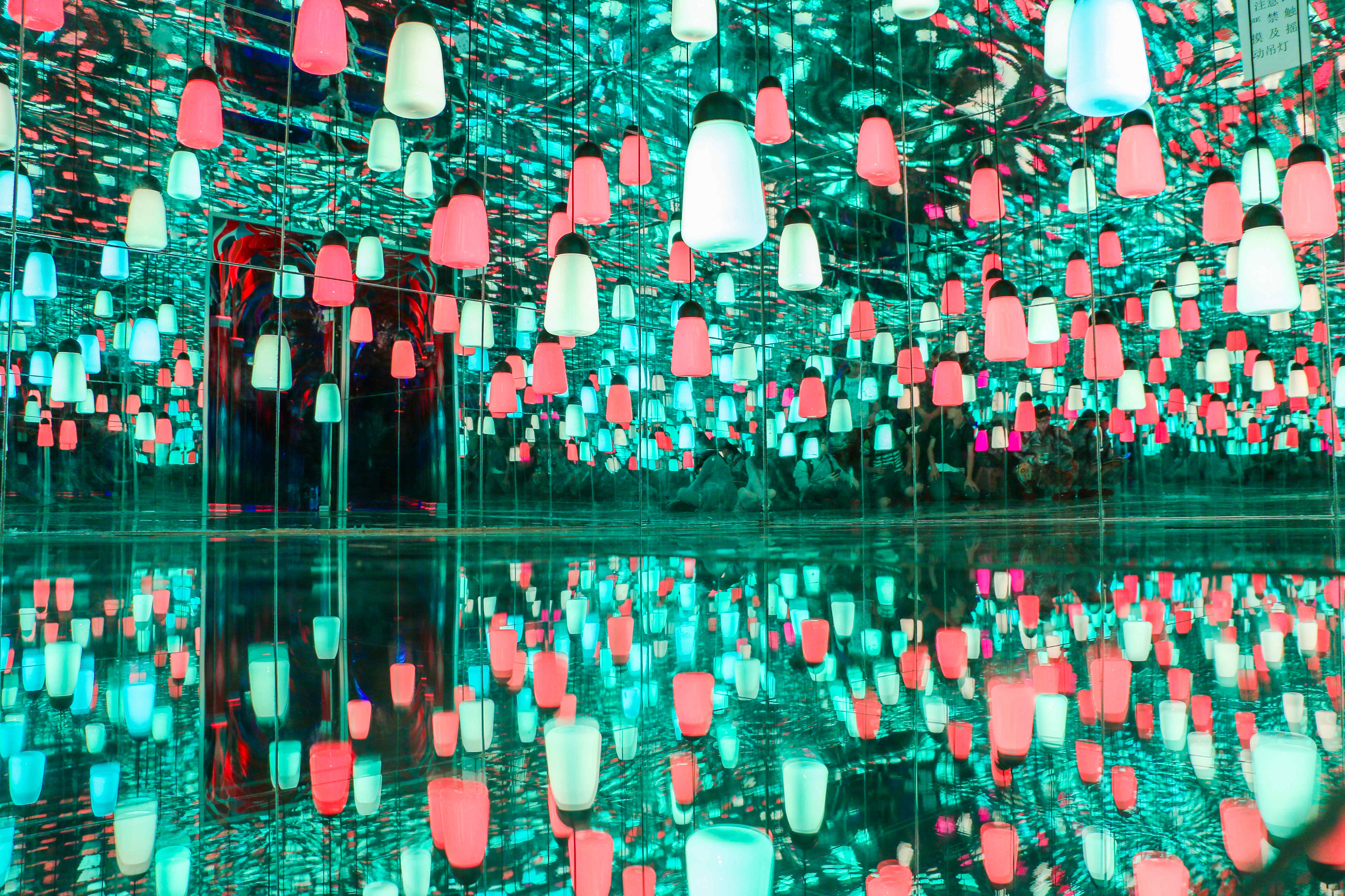 这一片的灯光形状类似泰国清迈的天灯节,四面环绕的镜面把这个空间放映得更加的宽阔,天灯像是在四周升起,美到窒息;又宛如画卷一般,美丽的色彩徐徐展开,令人陶醉其中。