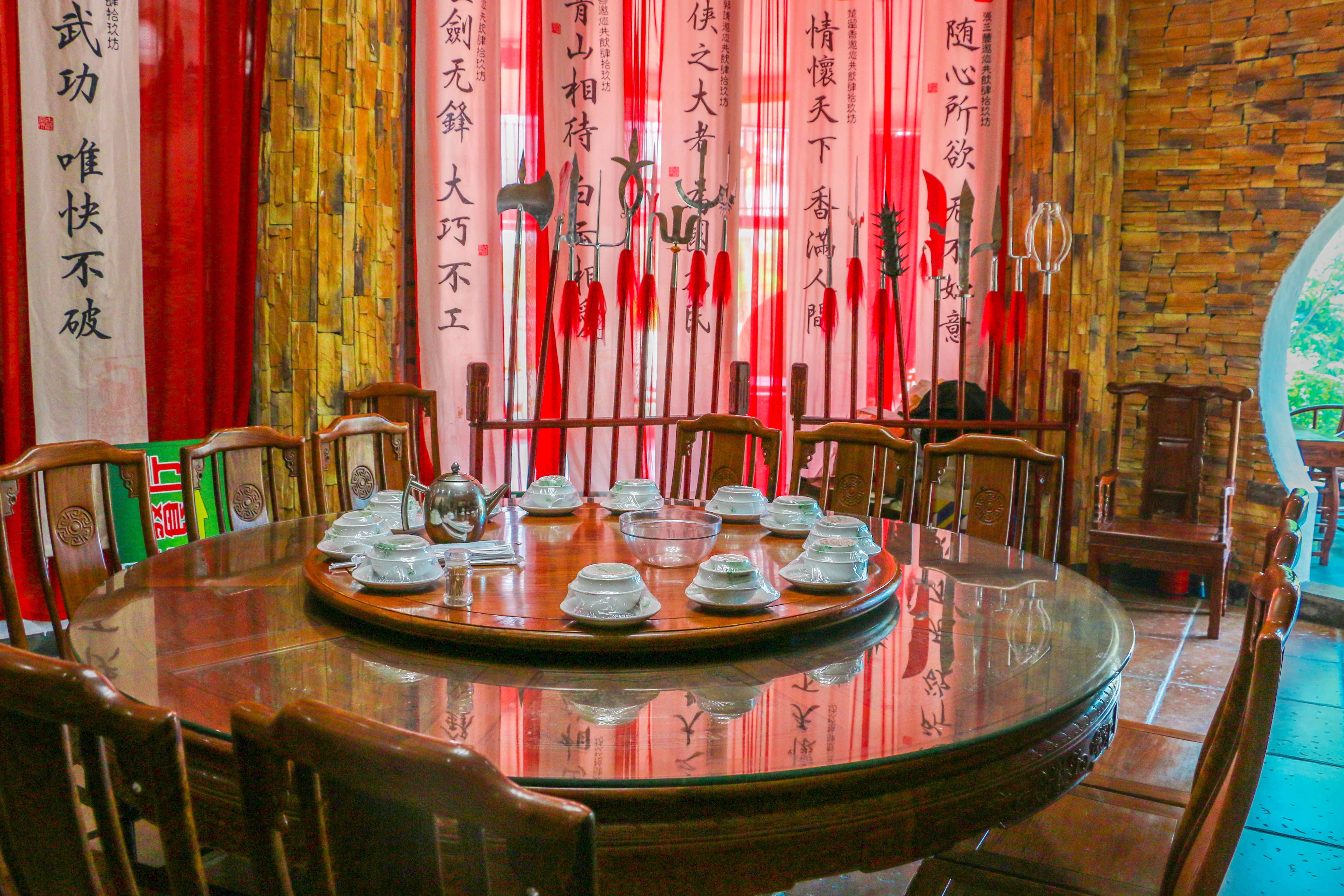 景区旁有家农夫当家餐厅,午时在这里吃了一桌子的清远风味农家菜,包厢江湖气(武器)十足,刚进来时恍如走进江湖中的一家酒馆,饭桌旁还有一个小茶室,饭后可以在茶室饮茶小憩,边看窗外绿意盎然的景色。