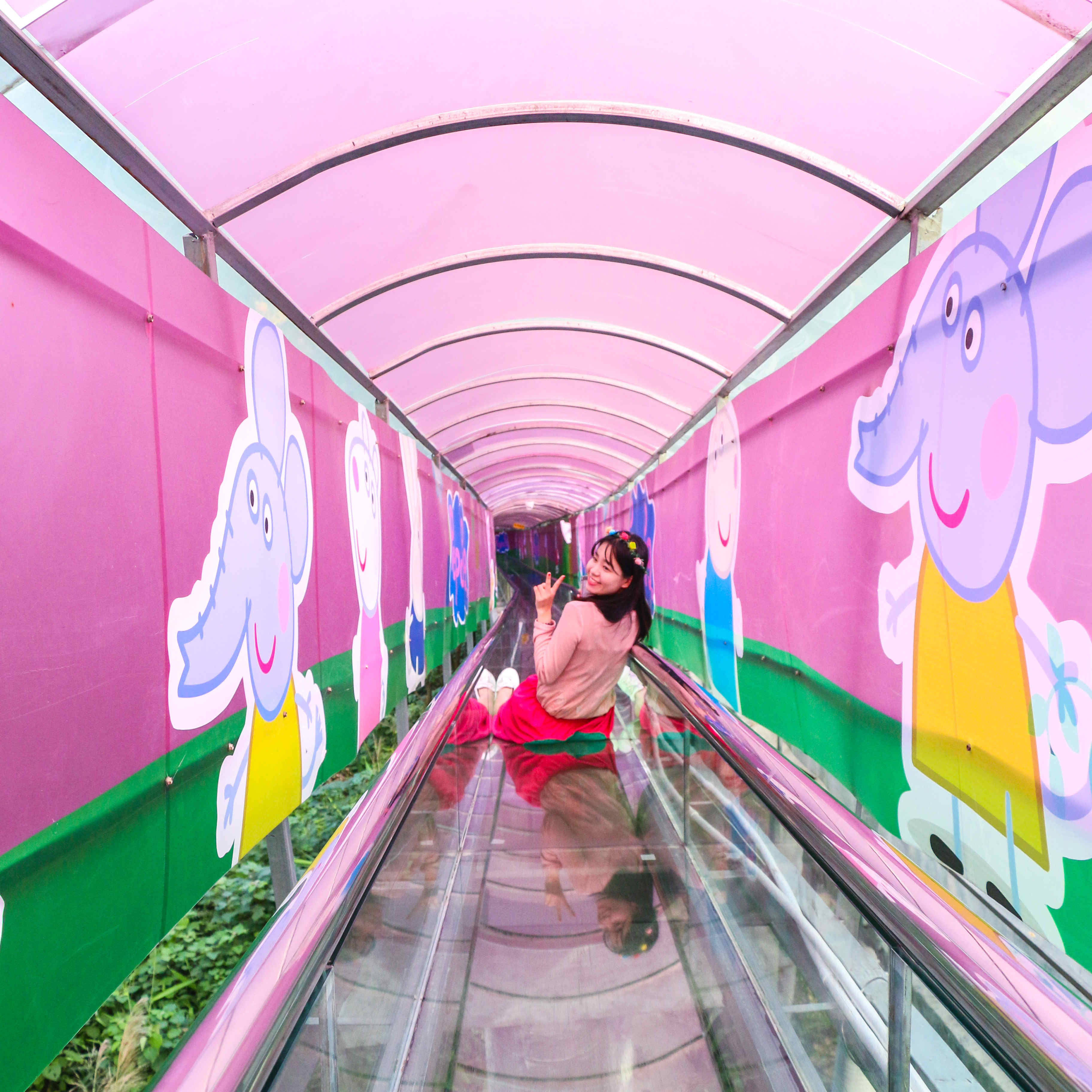 粉红滑道是牛鱼嘴原始生态风景区里必体验的项目之一,粉红的色彩正好满足我的少女心。从粉红滑道下去需要穿一条减小摩擦的裤子,如果全程不停,到达终点仅需55秒,想要停下来拍照的话,用脚踩着两边即可。