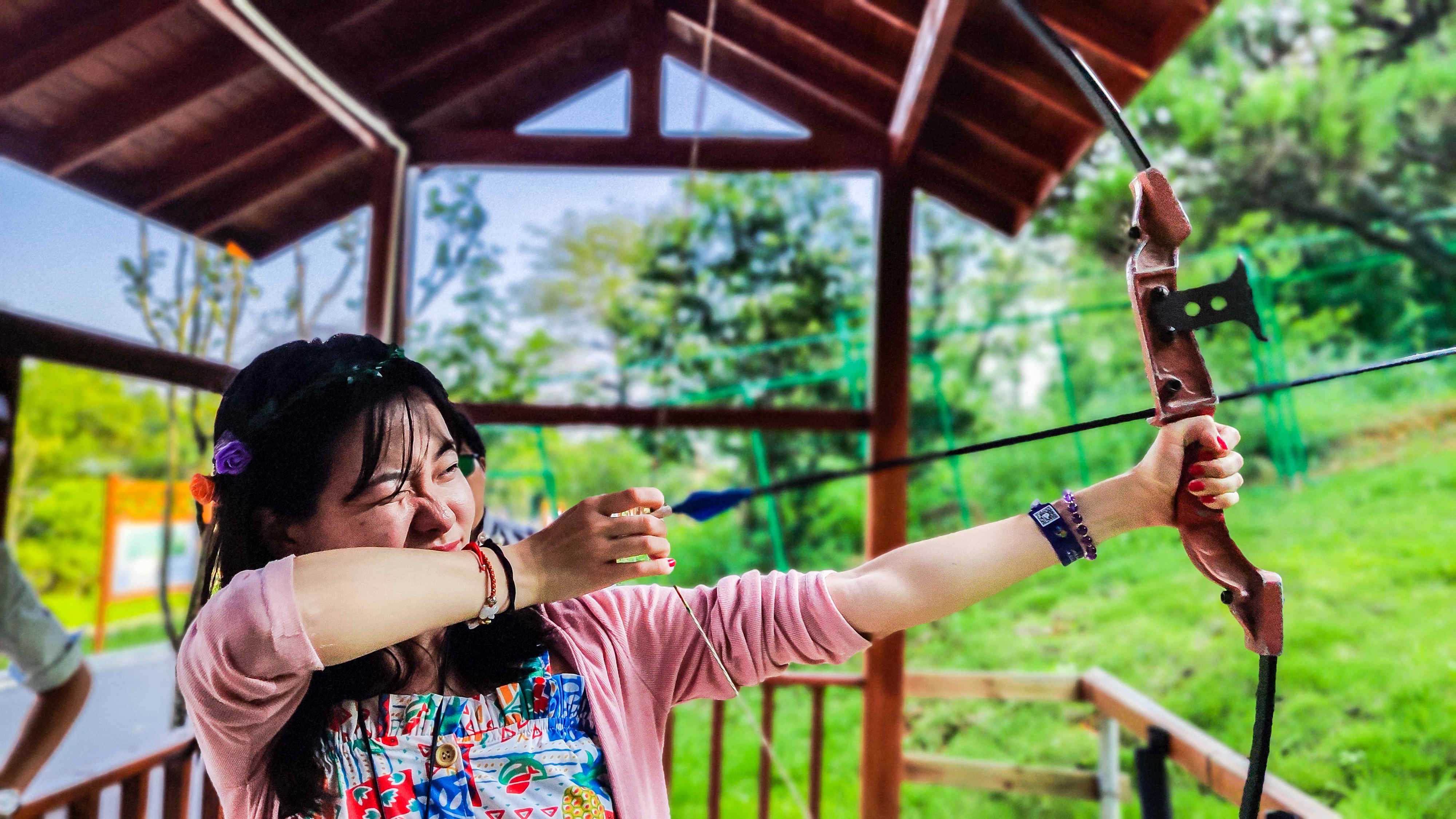 第一次体验射箭是在牛鱼嘴体验的,身旁的教练告诉我,左手拿弓,右手拉弓,拉弓要拉到脸颊处才算有力,听上去容易,实践起来发现自己的力气并够不到脸颊处,看来射箭也是体力活呀,虽然没有中靶,但这确是一次值得回味的体验。