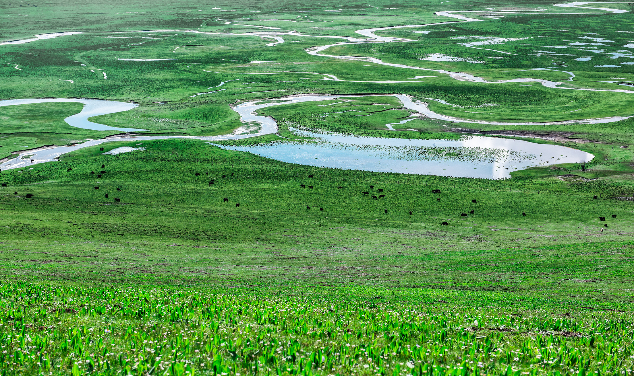 天苍苍,野茫茫,草原上牛羊悠闲的吧唧吧唧吃草,马儿滋儿滋儿的喝水,山间野花遍开,溪流纵横交错,此情此景醉人心田。