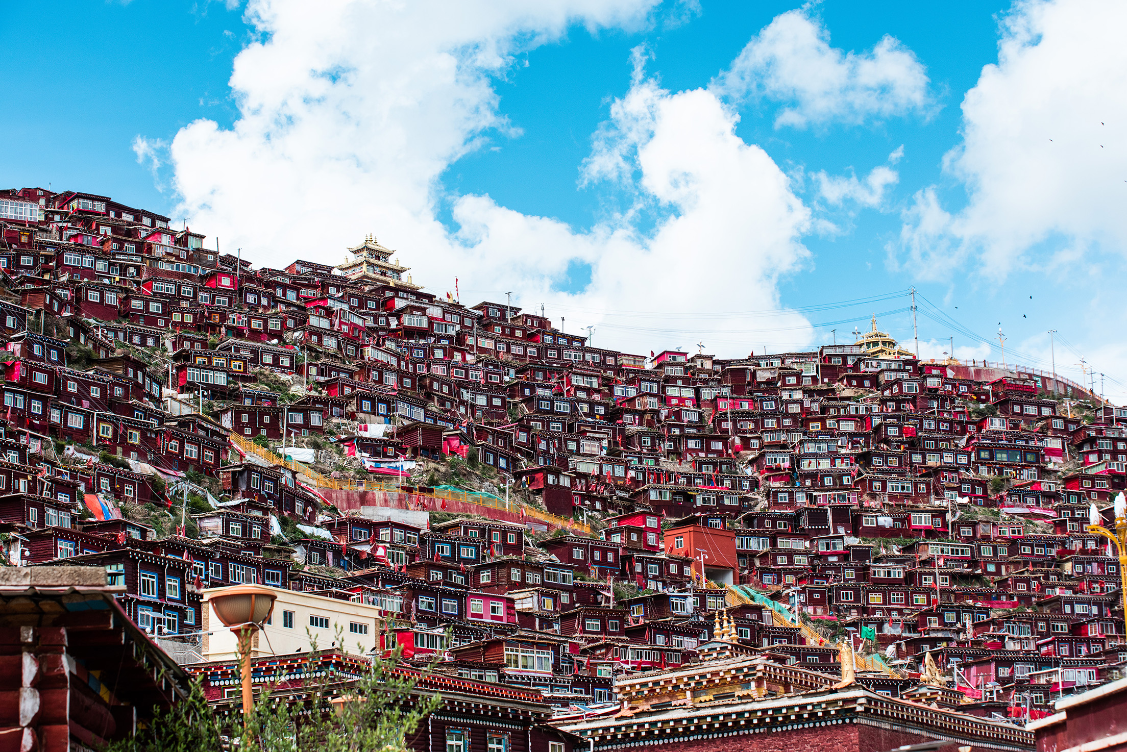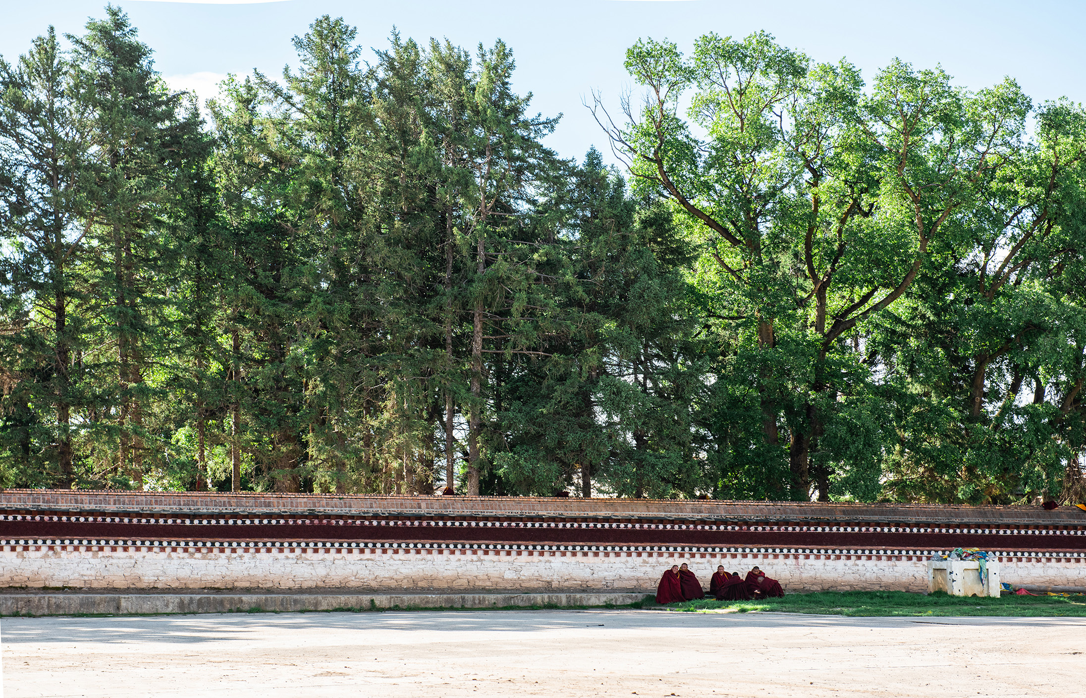 延绵起伏的绛红色小木屋蔚为壮观,整齐划一的坐落在这片山河之中。刚开始认识藏传佛教的时候是从《鹿鼎记》里知道的,那时候以为所有的藏传佛教僧人都叫喇嘛,其实不是,他们的称谓是有严格的划分的,一般男性修行者称为扎巴,女性修行者称为觉姆,像之前在拉卜楞寺的小僧人都可以叫阿卡,能称为喇嘛的一定是很有学问通过严格的考试达到一定学识的老师级别的,应该相当于教授,而活佛也不是只有一个人,自然转世灵童也不是只有一个了。