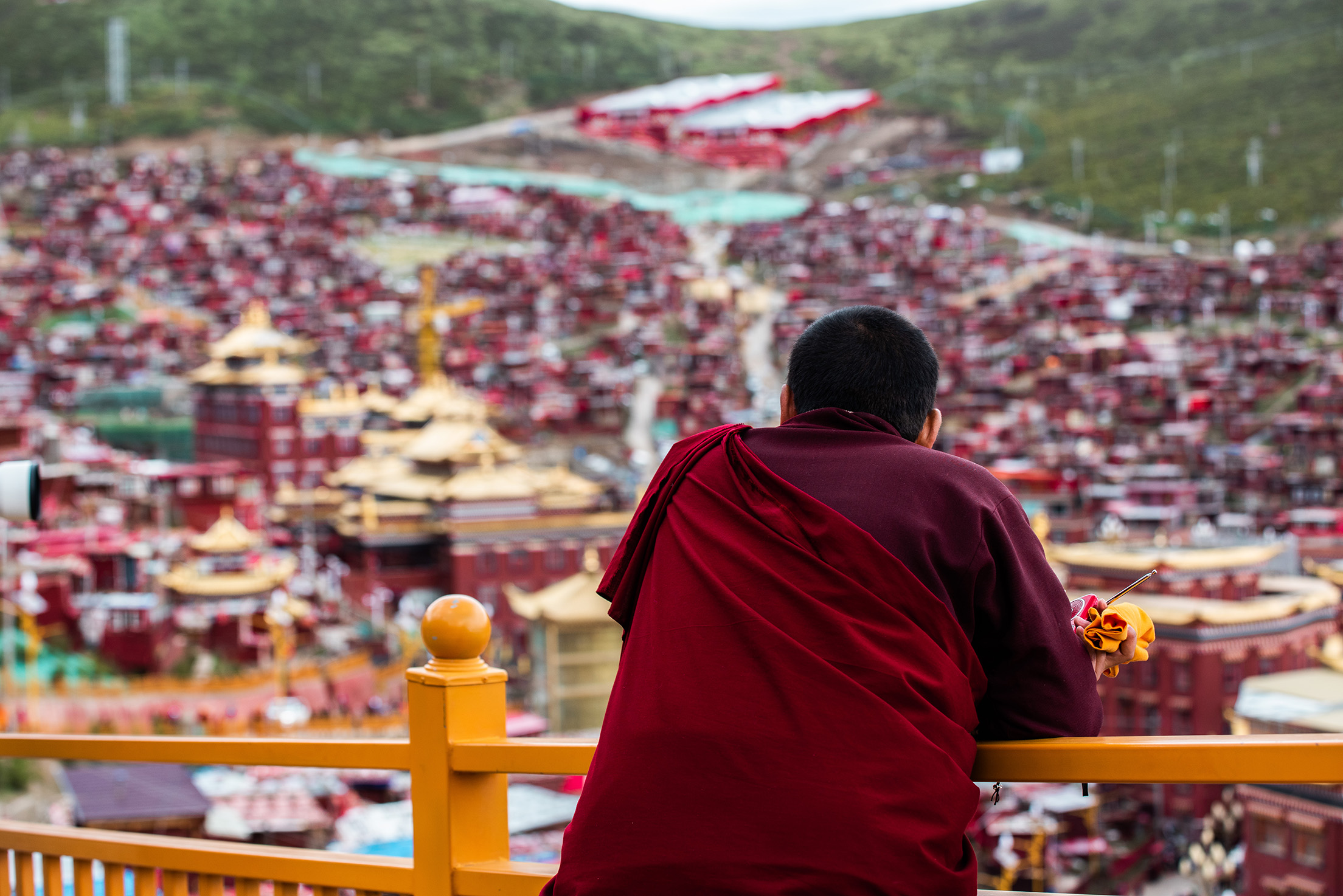 藏传佛教分四大派系,宁玛派(红教)、噶举派(白教)、格鲁派(黄教)、萨迦派(花教),以及追溯历史的原始宗教苯教现在依然存在,苯教也可以叫做黑教,严格来说应该是五个,当然也还有一些小的派系。用不同颜色来代表是根据它们的服饰特点以及历史意义而定的,我们今天要来参观的就是色达山河一片红的宁玛派五明佛学院。