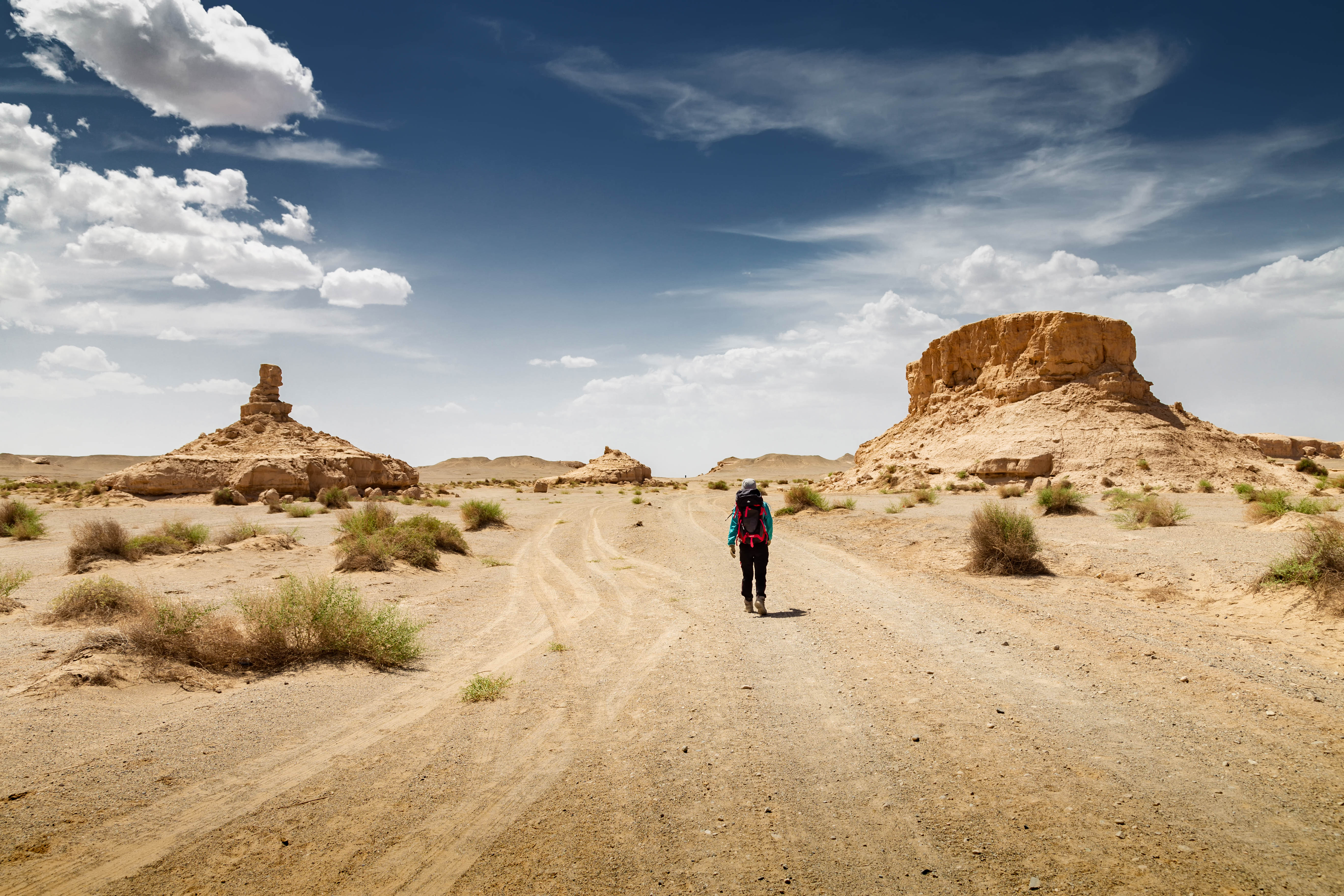 当天是三天中最绝望的一天,30多公里戈壁滩,没有一丝遮挡。加上领队,我们一共九个人,外加一辆车,行走在茫茫戈壁上。慢慢的,有人因身体不适而选择坐车,最后,只剩下三个队员还在坚持行走。
