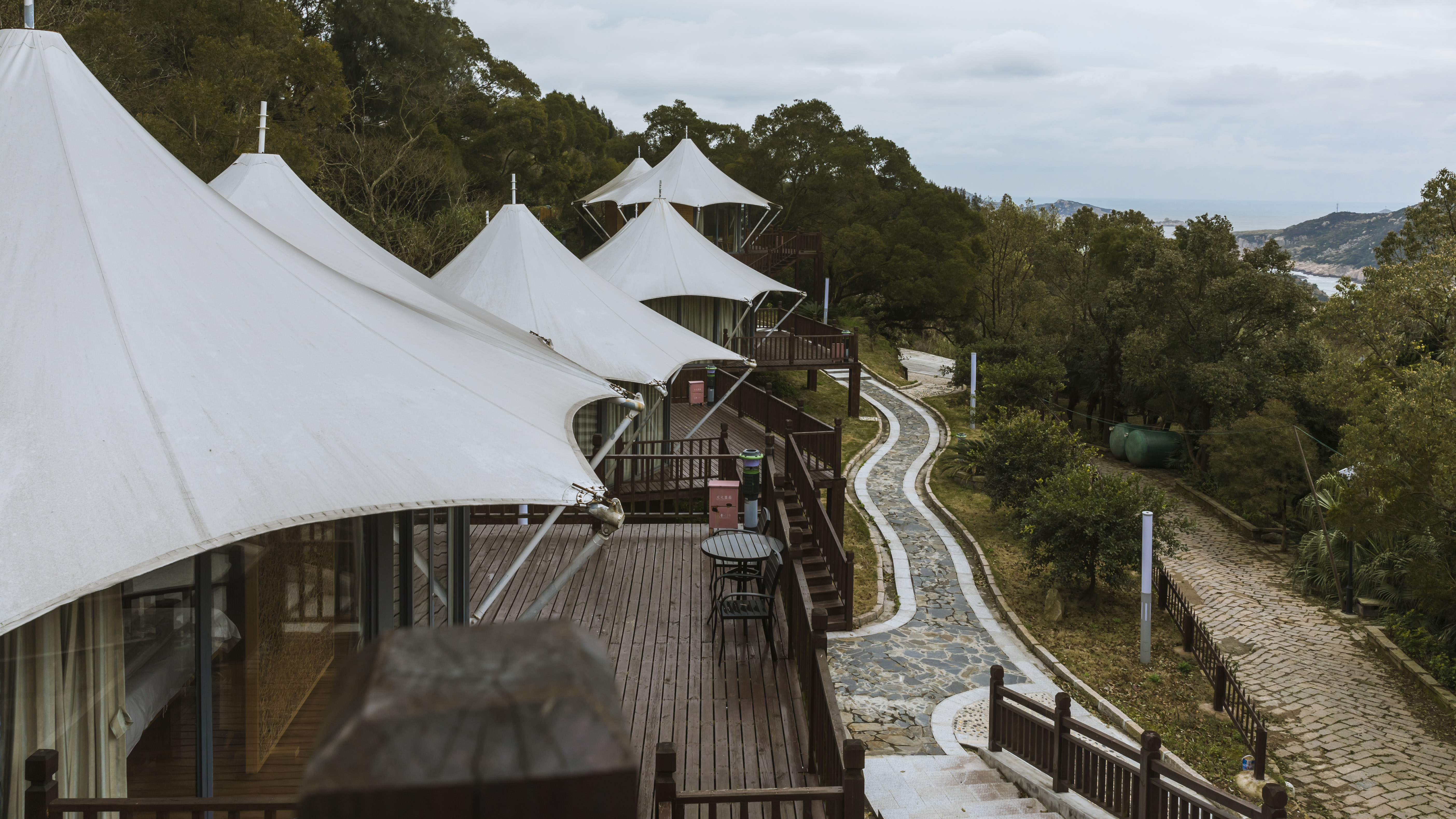 每一间房都是一幢独立的小楼,每一幢小楼都有独立的走廊和阳台。屋顶是白色风帆状的,所有的墙面都用落地大玻璃代替,整个房间极具设计感,古朴禅意而又异国风情。
