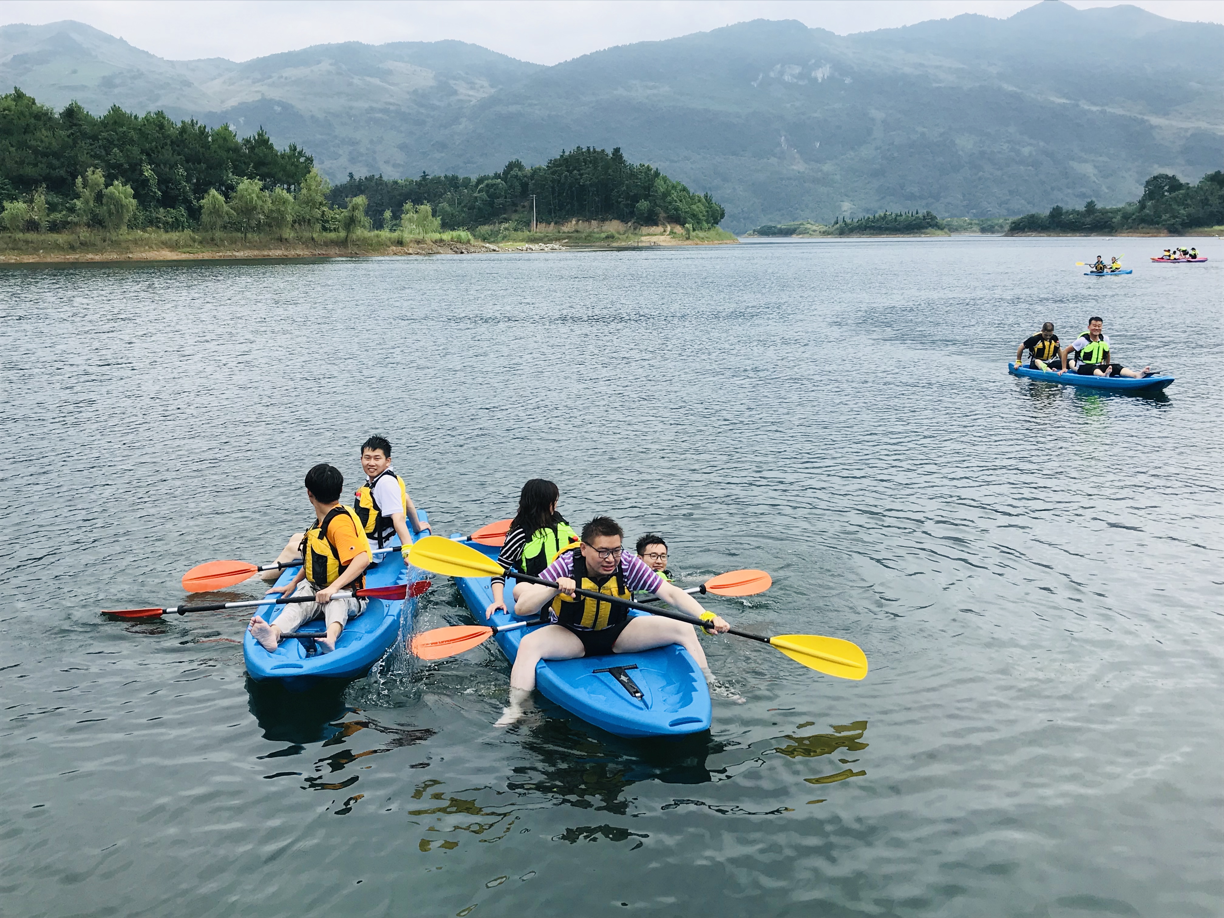 集合看这阵势,激情满满是不是很刺激,教练引导,如何,进,退,转弯,注意事项,然后下水,一下水都撒丫子划,感觉要翻船,最好有几位没有下水的漂亮小姐姐看着是不是也很心动呢,,湖水很清澈,很凉,很舒服,依山傍水的美好好感受,,