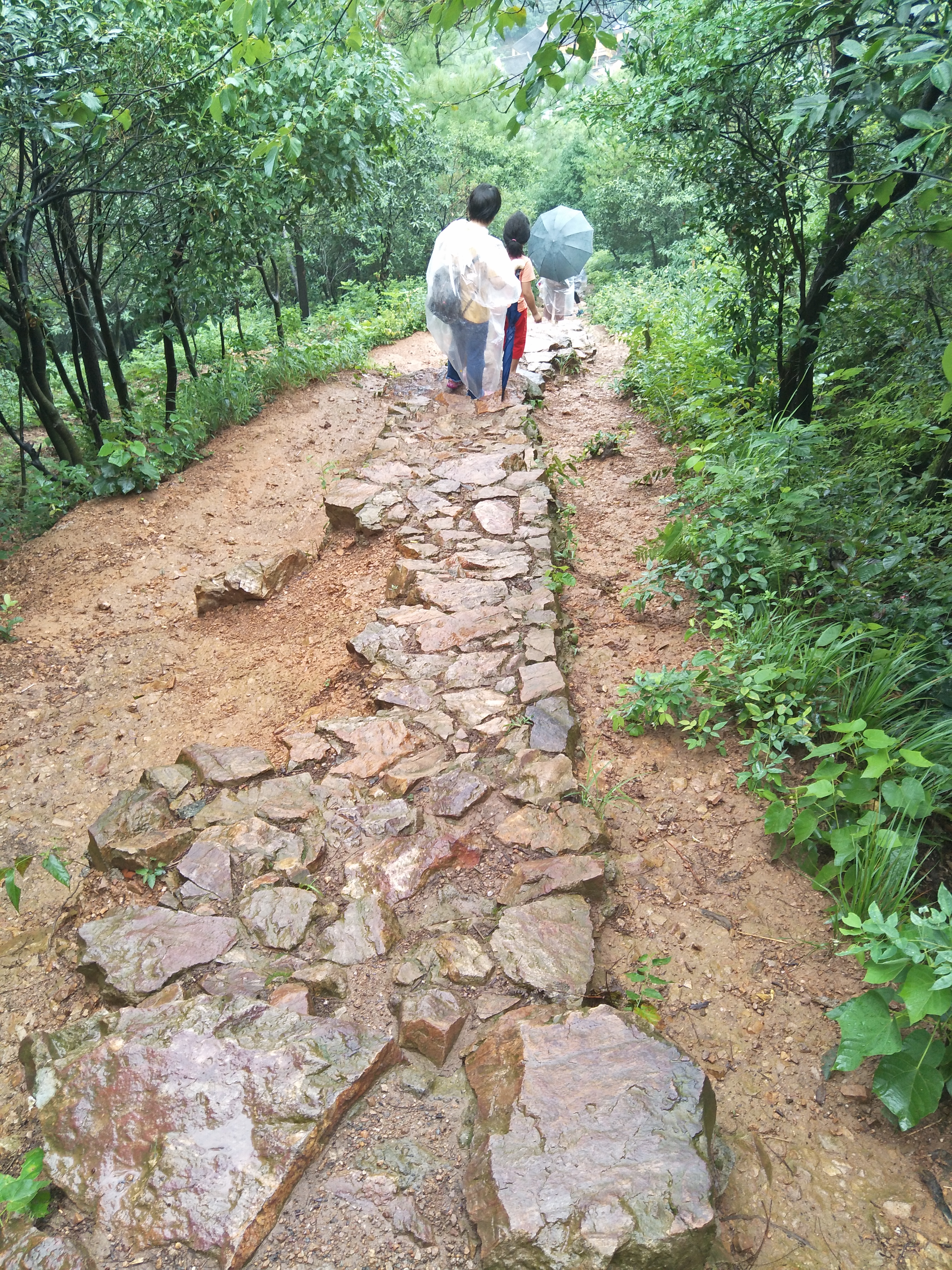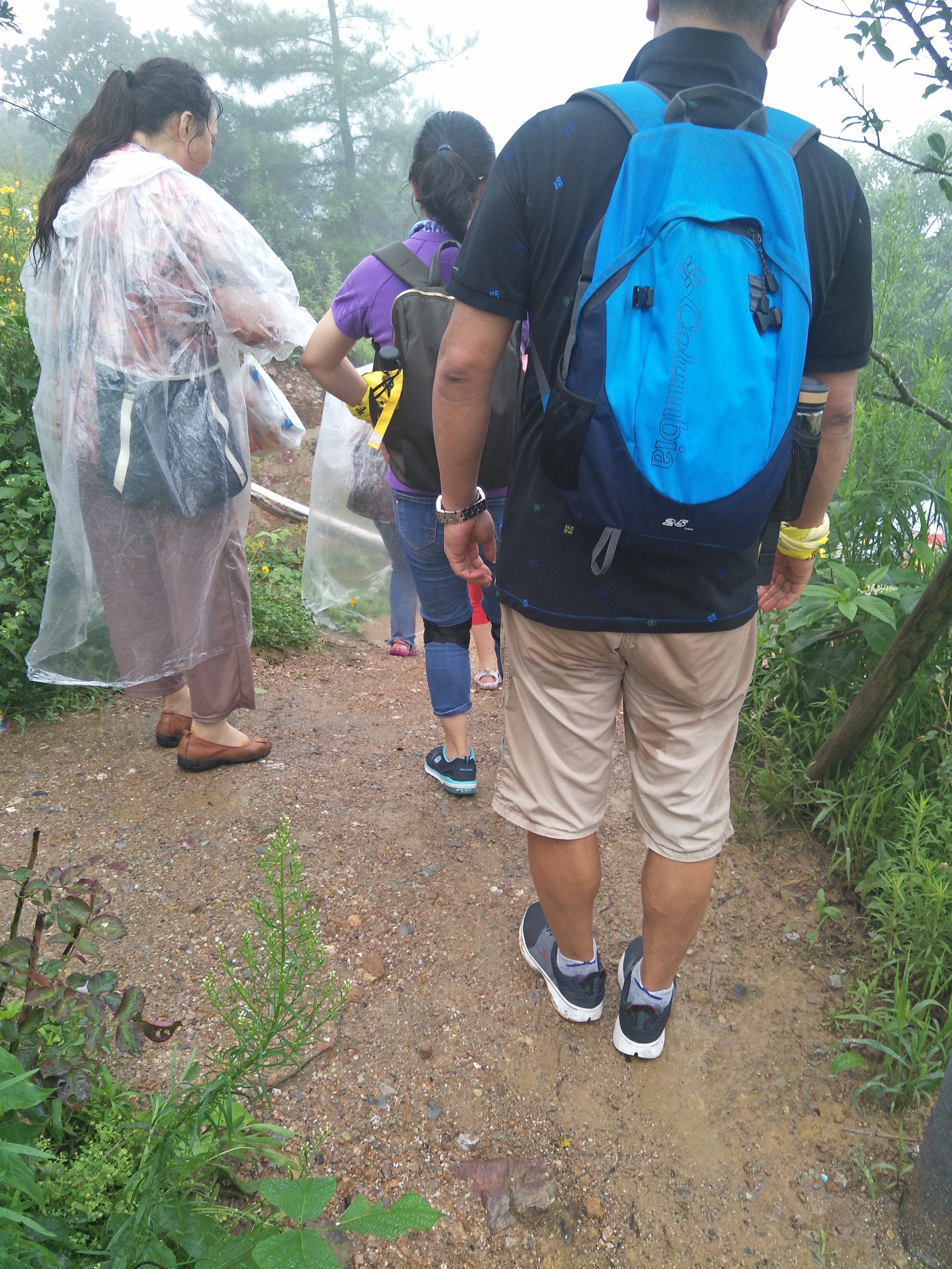 赶到明申和美女领队碰头,点名确认人数,14位大小伙伴都到齐了,7点40分我们准时出发苏州了,一路上小朋友都很开心😊,每个小朋友都自我介绍及才艺展示,有的唱歌、有的讲笑话、有的猜谜等等,在欢笑声中不知不觉的我们就到目的地了。我们要准备登山了,其中有6位大小伙伴不能登山,应用她们穿的是拖鞋,好可惜啊!不过她们可以先去温泉戏水去,也不错。能登山的一群人就这样穿着雨衣前行了,出发……