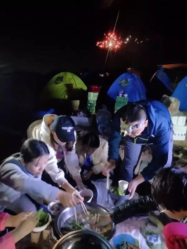 烟花就着酒,越喝越有feel。由此张照片可见,大家的第一顿晚餐是多么的迫不及待啊,尤其是社会王的霸气,恨不得一开锅把锅盖都捞走。