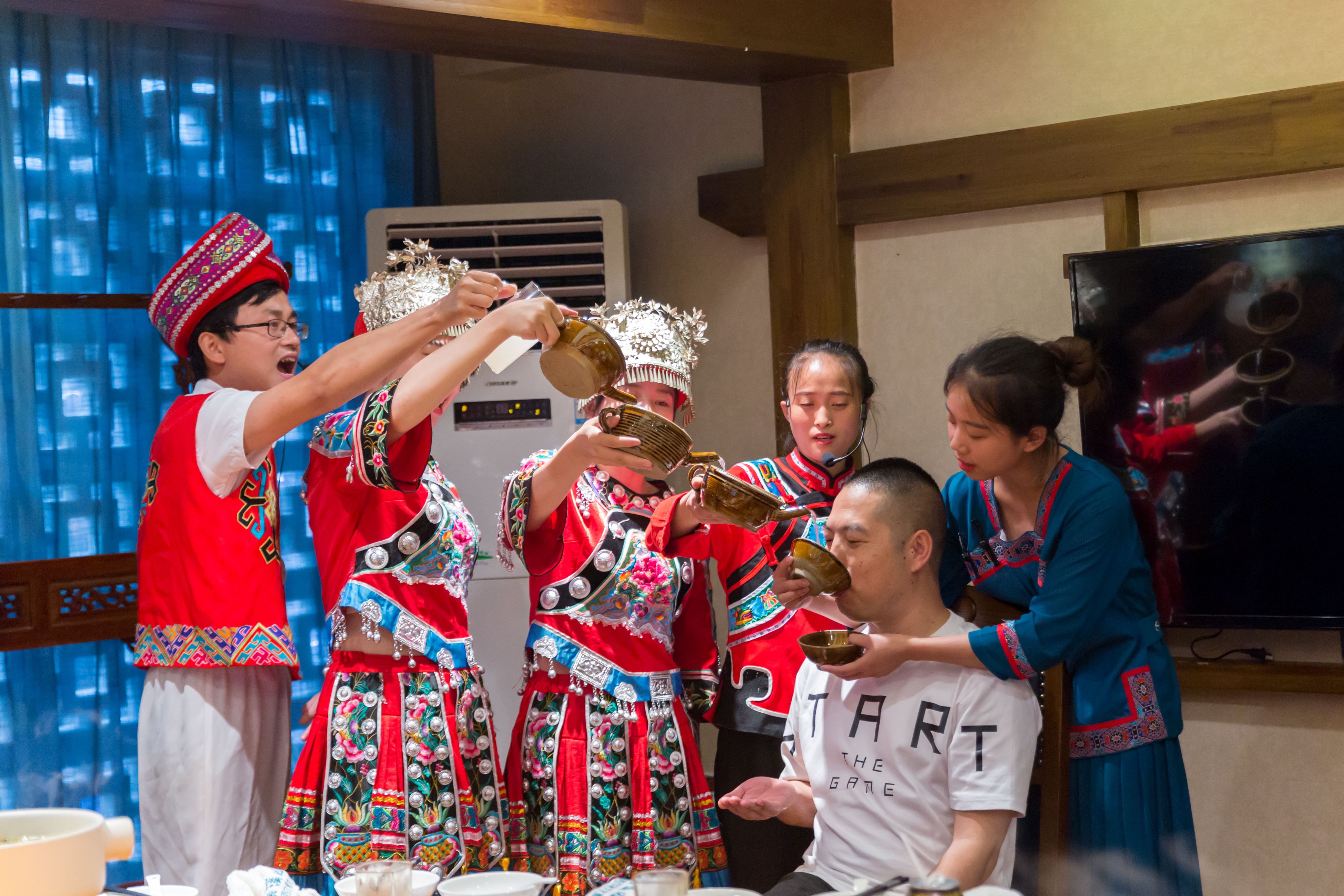 少数民族待客热情,有“无酒不成席”之说,她们的酒如同苗家人的山、苗家人的水,山有多高,水就有多长,水有多深,酒坛就有多深!在湘西和贵州地带,客人吃到一半,苗族阿妹会敬酒祝兴,酒杯端着,歌声响起,“你喜欢也要喝,不喜欢也要喝,管你喜欢不喜欢,也要喝!”客人没反应过来,早已被“包围”,“高山流水”开始上演。