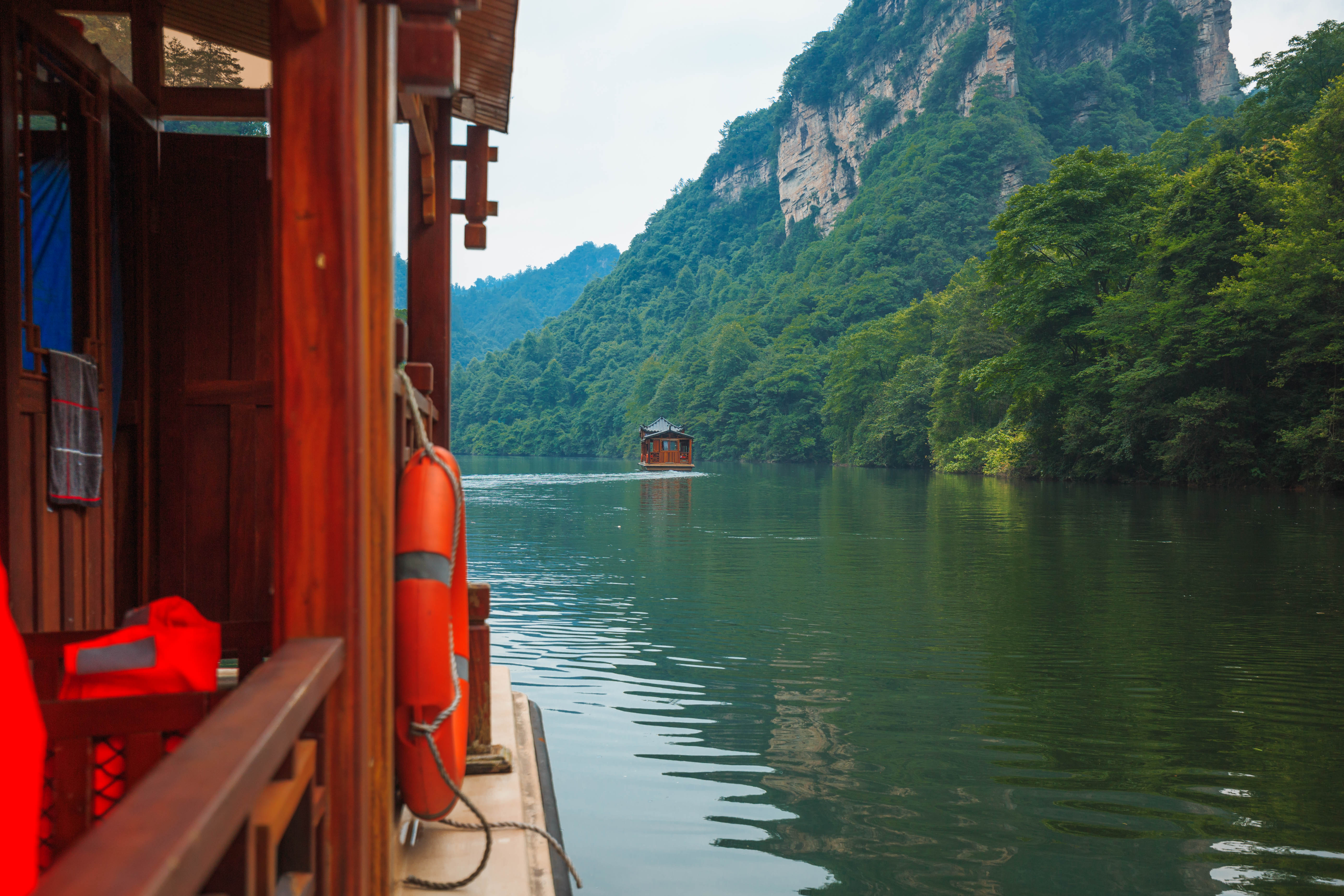 泛舟漫游,只见一湖绿水半湖倒影,充满诗情画意。"云梯万丈上天台,高峡平湖一鉴开,王母瑶池金扶,浣沙仙女下凡来"游宝峰湖,就会欣赏到这样的诗情画意。