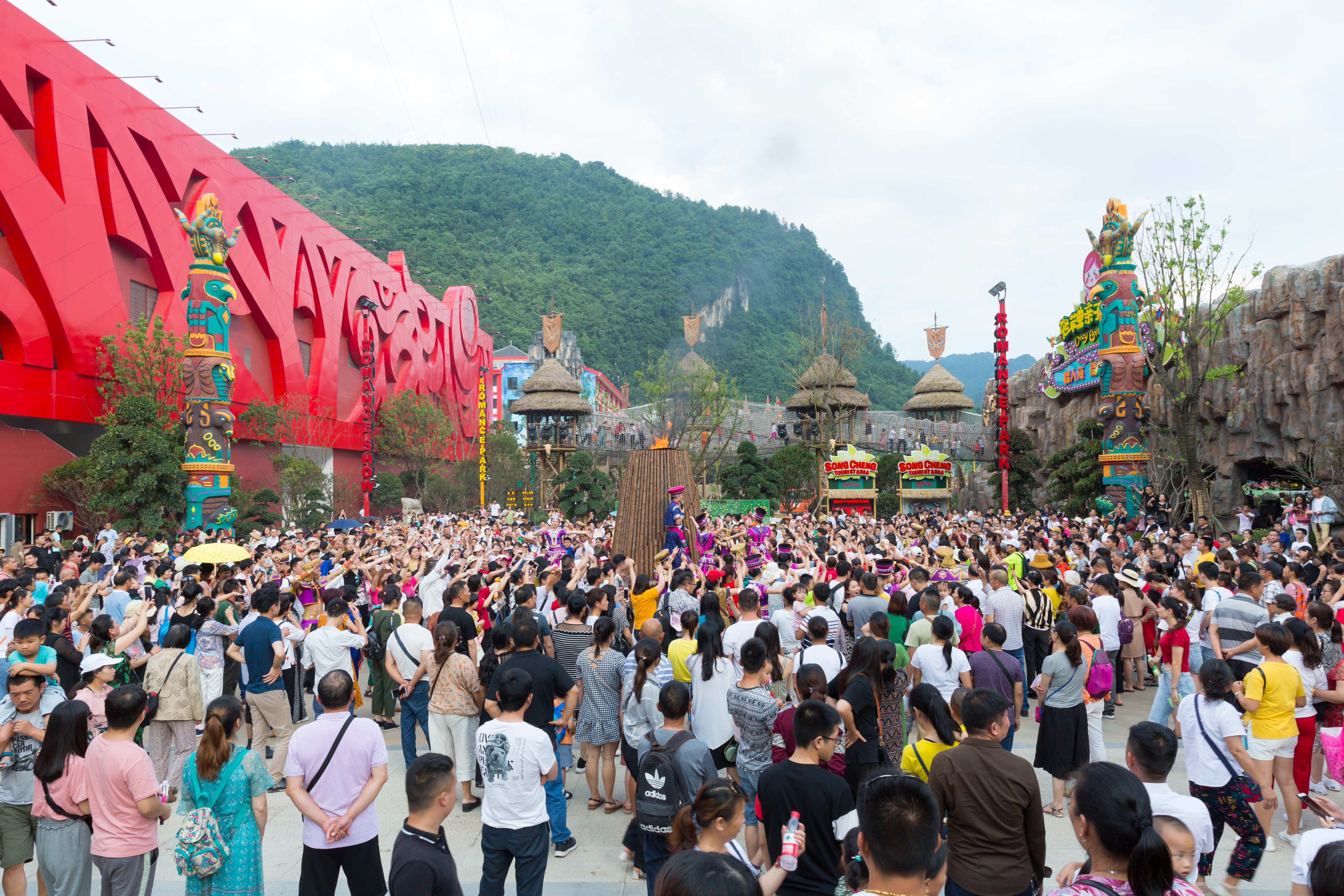 我们是下午两点到千古情的。围着整个景区转了一圈,园内由大庸古街、陶源秘境、情人海和烂苹果亲子乐园等几个部分组成。不同的时间在不同的地点会上演不同的互动节目,提前有一张节目单,就可以不费力体验完所有的项目。当然即使错过了也没关系,从下午晚上会有节目循环,再去补漏没有看到的活动也可以。