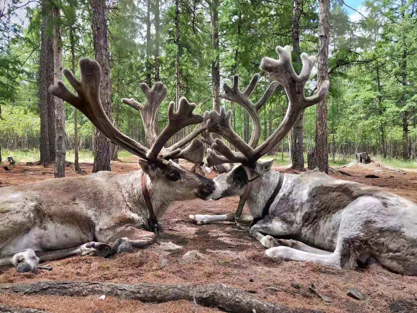 到达根河,看,驯鹿吃饱了都趴在地上,感觉很疲惫的样子,遍布驯鹿的森林里就像是另一个童话世界。敖鲁古雅使鹿部落里除了驯鹿还能看到狍子、野兔一些小动物,不过狍子是圈养的,看到我过来就跑掉了,和驯鹿一对比,傻狍子真是可爱!!1
