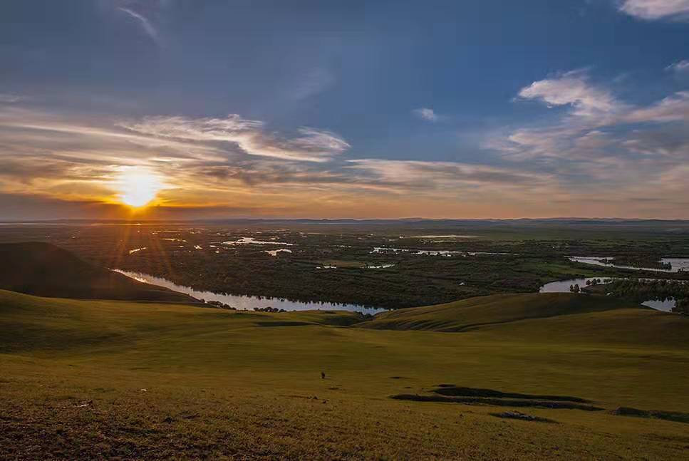 傍晚时分观看日落,一望无际的草原加上蜿蜒的河流,远处的草地、河流成了落日的背景。此时站在日落山之上就像置身在梦幻的世界,落日的余晖洒在我们的脸上、山川河流,由金色慢慢变成火红的世界,伴着晚霞的消散,太阳渐渐的落在了草原地平线之下.....