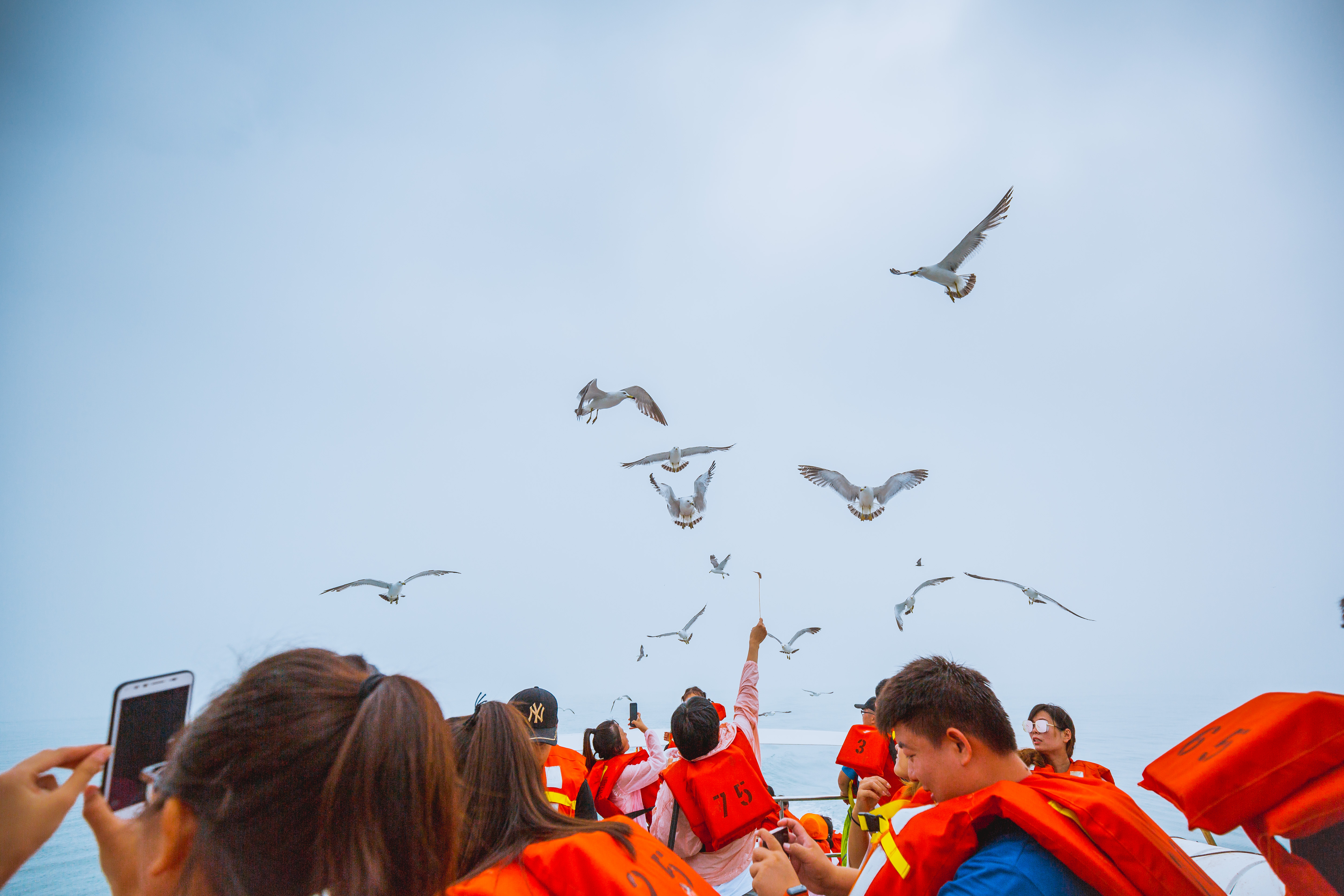 人与海鸥的亲密互动,是最勾你魂魄的地方。你可以用自己带的面包或者火腿肠,但是小鱼是海鸥的最爱,快艇上面有卖的10元,20元不等的小鱼,可以用竹签扎着小鱼举过头顶,海鸥会飞快的抢走小鱼。