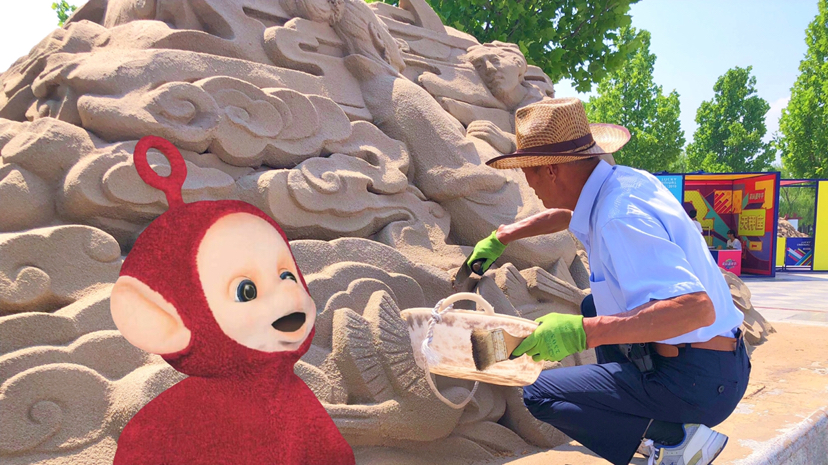 遇上修补“沙雕”的爷爷,烈日下端着水盆,颇有几分”大国工匠“的感觉。