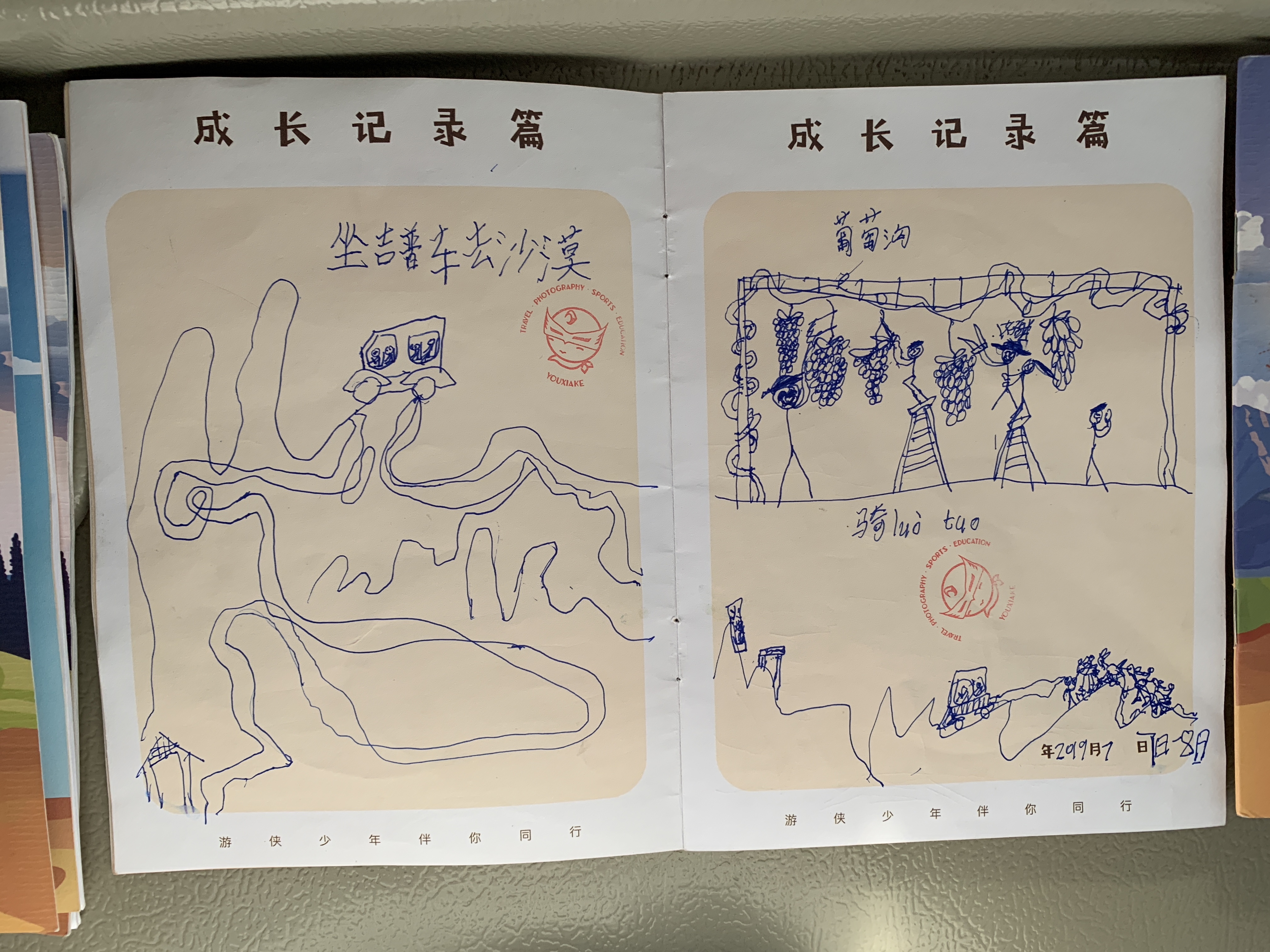 每个孩子年龄不同、地域不同、兴趣爱好不同……很多不同,但是我们去的是一样的地方,体验了一样的活动,但是在他们心里却有不同的记忆点。轩是唯一一个画出独库公路的日出、唐布拉的黑蜂庄园酒店的小朋友。心蕾是图文并茂而且相当有水准的记录了每天的行程。苹果是绘画最突出的(着重画自己。哈哈哈)小朋友。小鱼儿是最小的孩子,虽然很多字不会写用拼音(还拼错),但是应该是最值得嘉奖的孩子。糖宝是唯一一个将每天的旅行日记的错别字进行修改的宝贝……每个孩子都是那么的独一无二,给我们的旅行带来了不少的欢声笑语。谢谢你们~~
