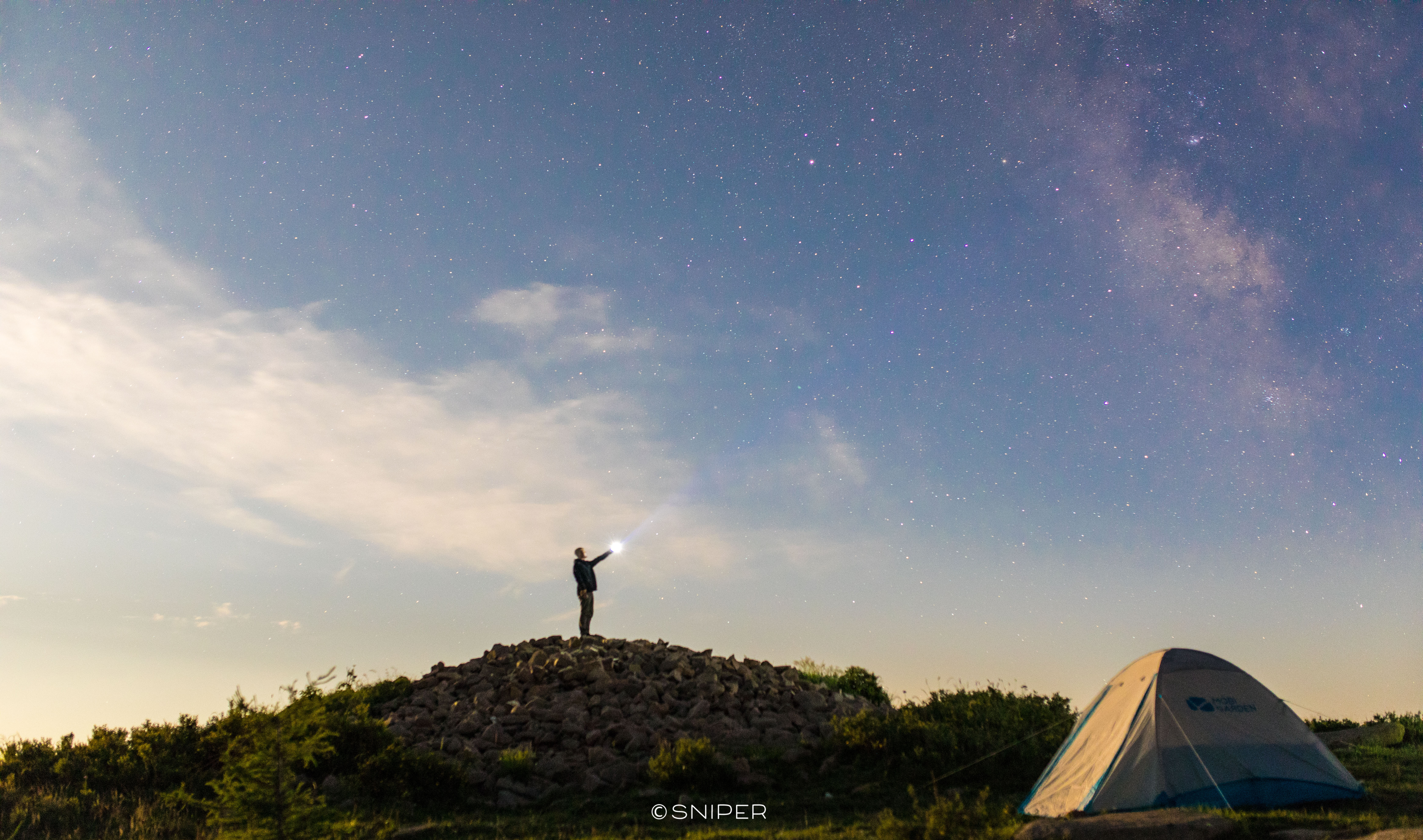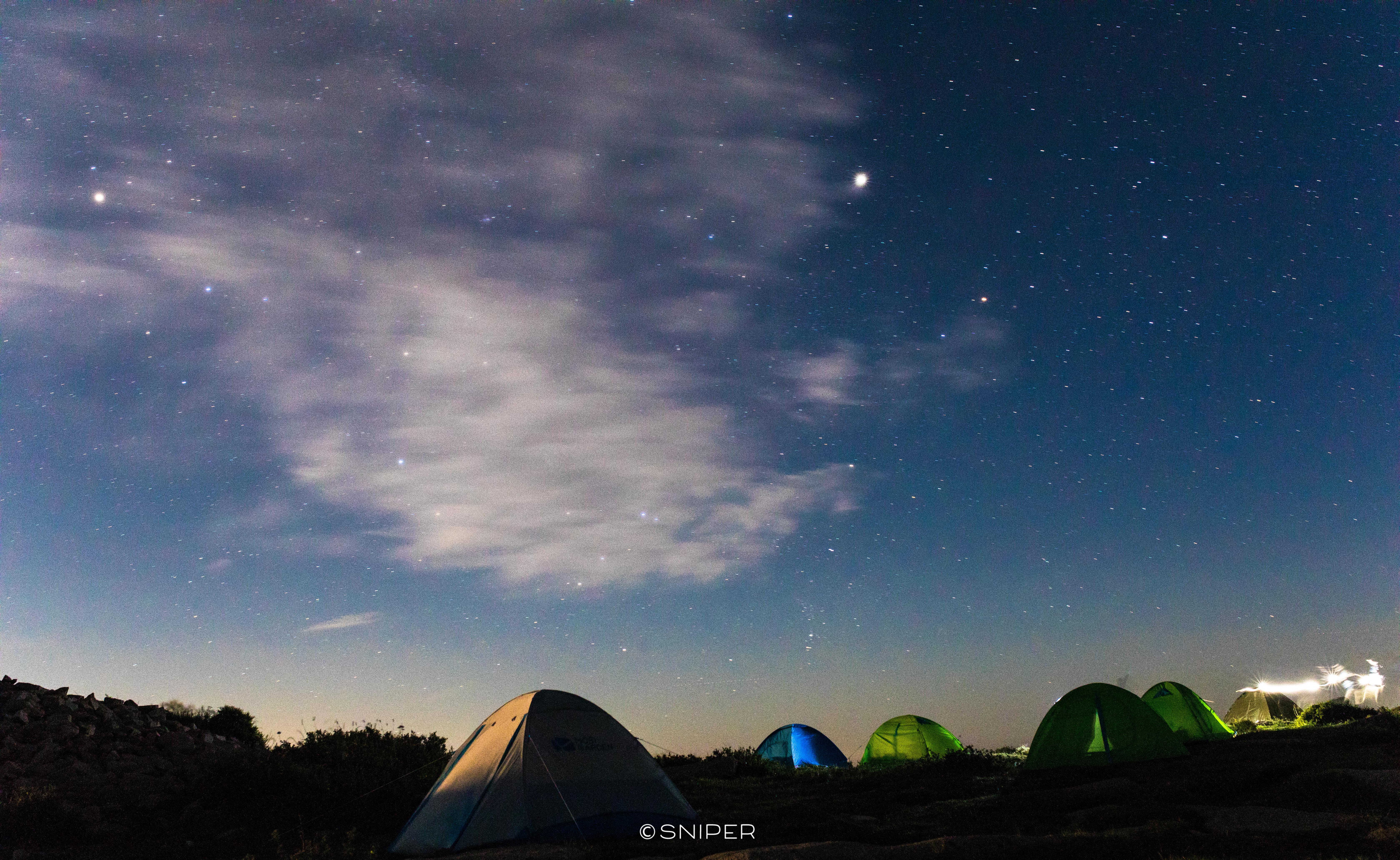 山上露营的人很多,可以看到不远处,熙熙攘攘的欢乐声,有欢快歌唱的、有蹦迪电音的、有专心拍银河的、有两情相悦星空下聊着天的…还有我们,一群欢快的游侠客!!!