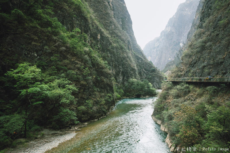 最后一个地点,来到了巴拉格宗大峡谷。香格里拉大峡谷全长约154公里。这里野趣盎然、古树茂密,河水如同丝带般蜿蜒奔流,来到这里的时候下起了小雨,沿着栈道走沿途的水流一直很清澈,山的倒影就在水中,导游说来这是可以治疗颈椎病的,人们都会时不时地向天空看。